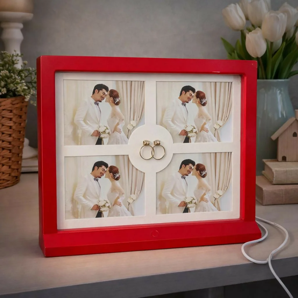 Preserve your precious memories in style with this elegant LED photo frame collage designed to hold four photos. Featuring a modern layout with soft glowing lights, this decorative frame beautifully highlights your special moments. The built-in LED lighting adds warmth and charm, making it a perfect addition to bedrooms, living rooms, or bedside tables. Ideal for showcasing couple photos, wedding memories, or family moments, it also makes a thoughtful gift for anniversaries, weddings, and special occasions.