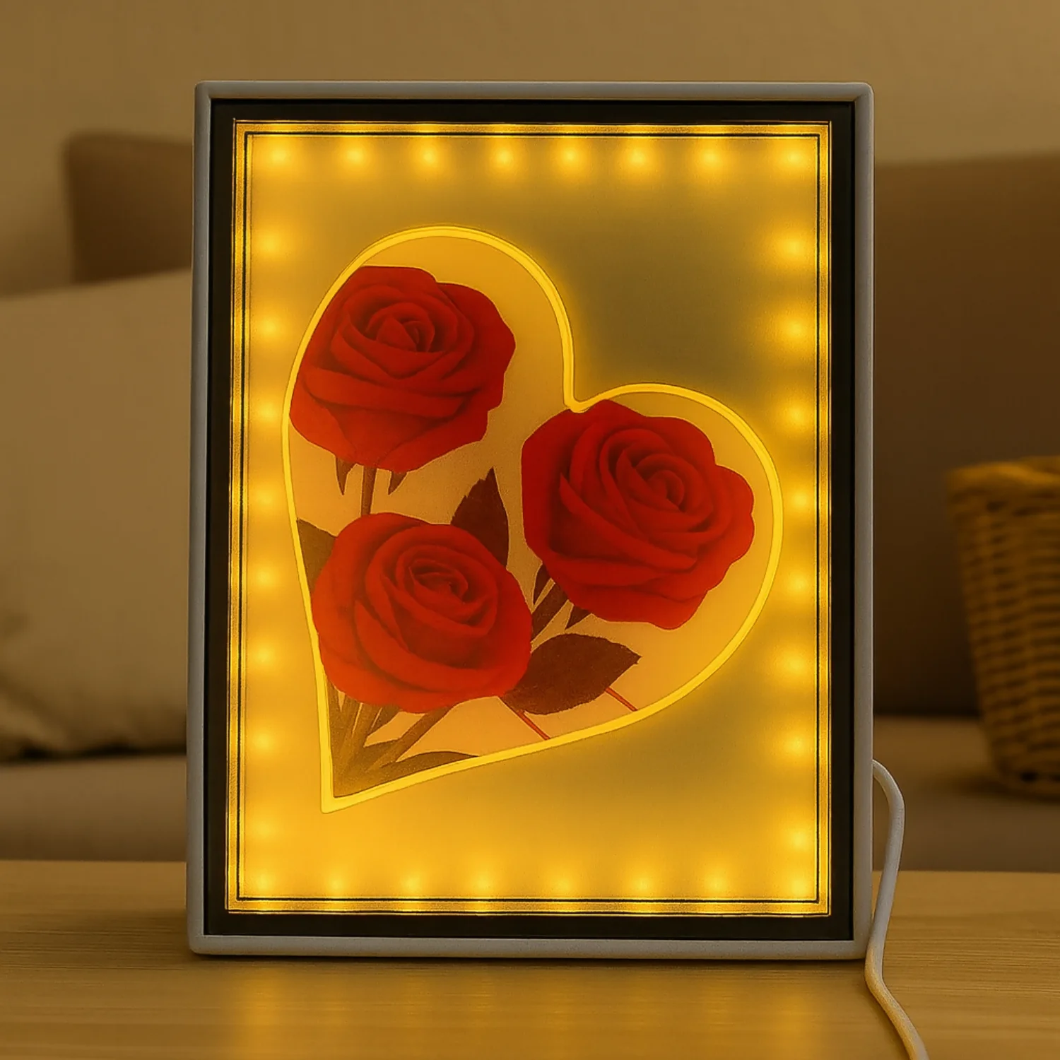 heart rose LED frame, romantic floral LED light frame, glowing love heart photo frame, wedding anniversary LED décor, Valentine’s Day rose heart frame, romantic red rose LED lamp, decorative heart shape light frame, modern LED wall photo frame, couple romantic LED gift, floral heart light up frame