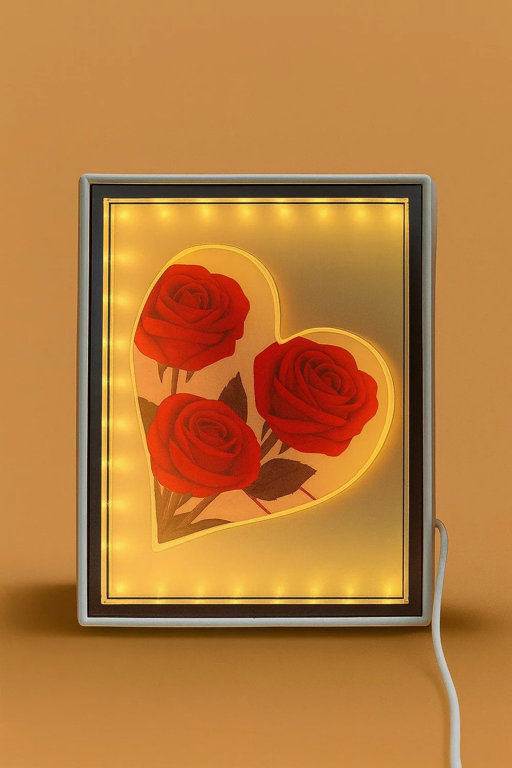 Add romance and charm to your home with this LED Rectangle Frame, featuring a glowing heart design filled with red roses. Surrounded by a soft golden LED light border, this frame beautifully illuminates the artwork, making it a perfect décor piece for bedrooms, living rooms, or bedside tables. Ideal as a wedding, anniversary, or Valentine’s Day gift, this light-up frame combines elegance and functionality—serving as both a romantic lamp and a floral keepsake.