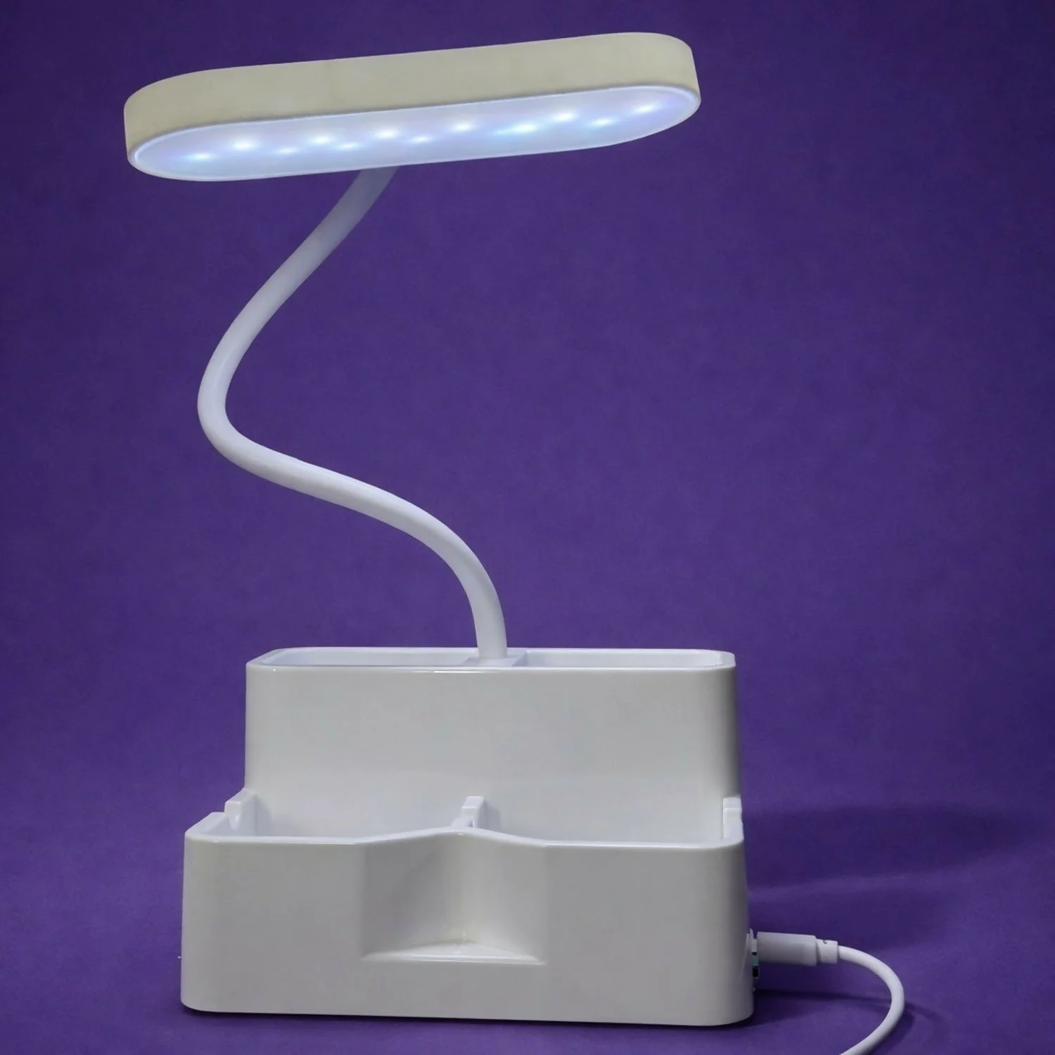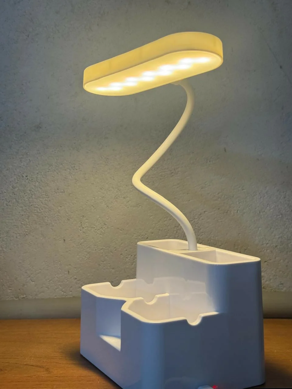 The flexible gooseneck arm offers 360° adjustability, ensuring focused illumination from any angle. Built with an integrated pen stand and storage compartments, it keeps stationery, small accessories, and essentials neatly organized on your desk.