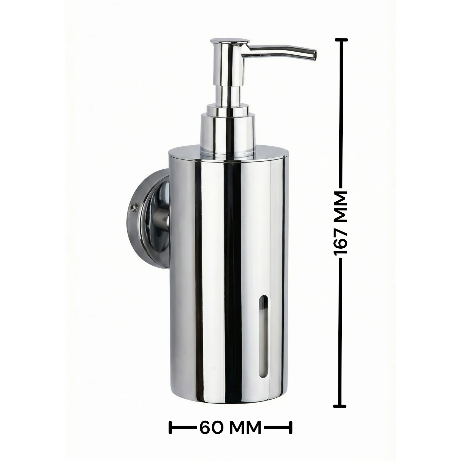 The dispenser features a cylindrical body made of S.S. 202 stainless steel with a polished chrome finish that delivers a clean, premium appearance. The material offers good strength, durability, and resistance to everyday moisture, making it suitable for regular bathroom use while remaining easy to clean and maintain.