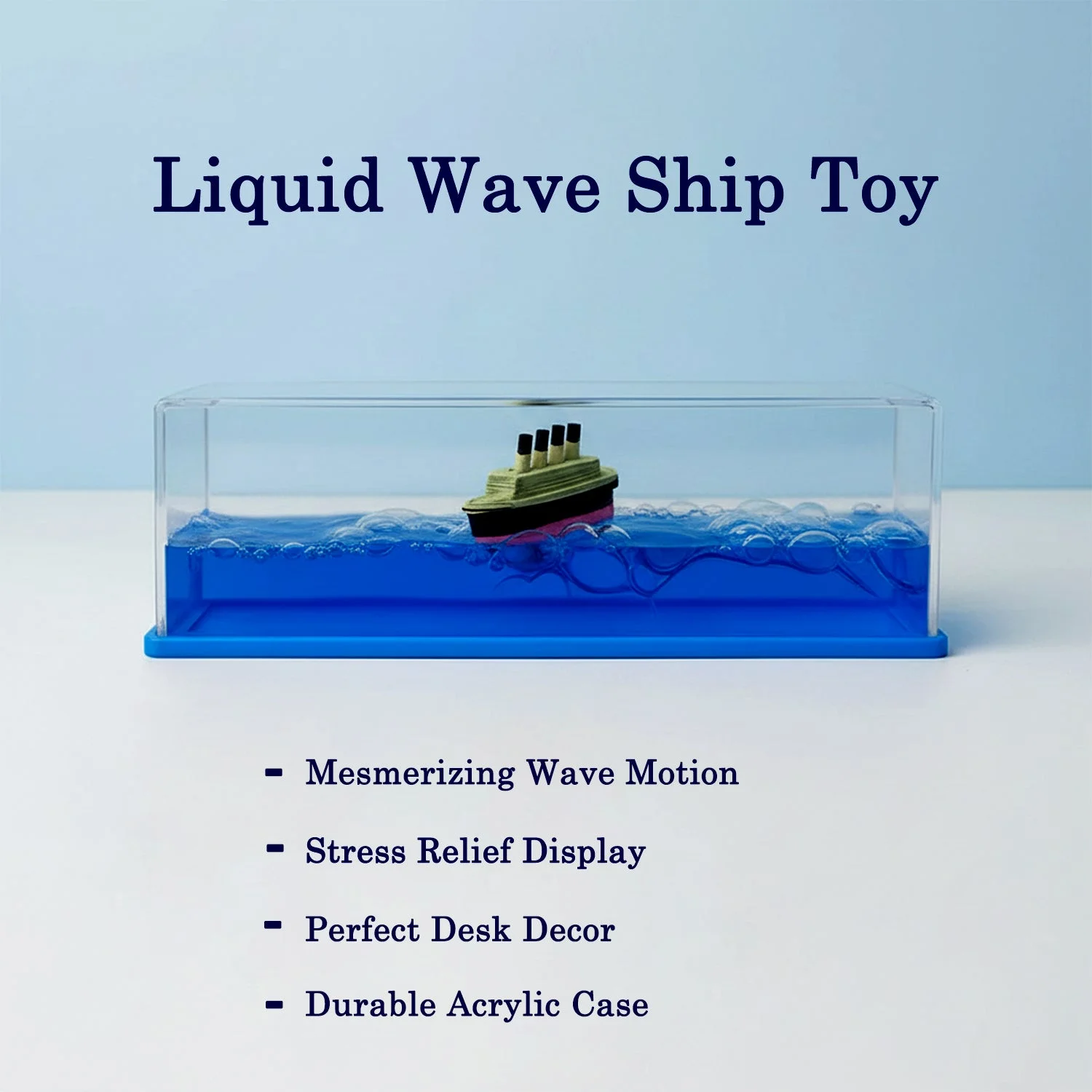 This Liquid Wave Ship Motion Toy features a floating ship inside moving blue liquid