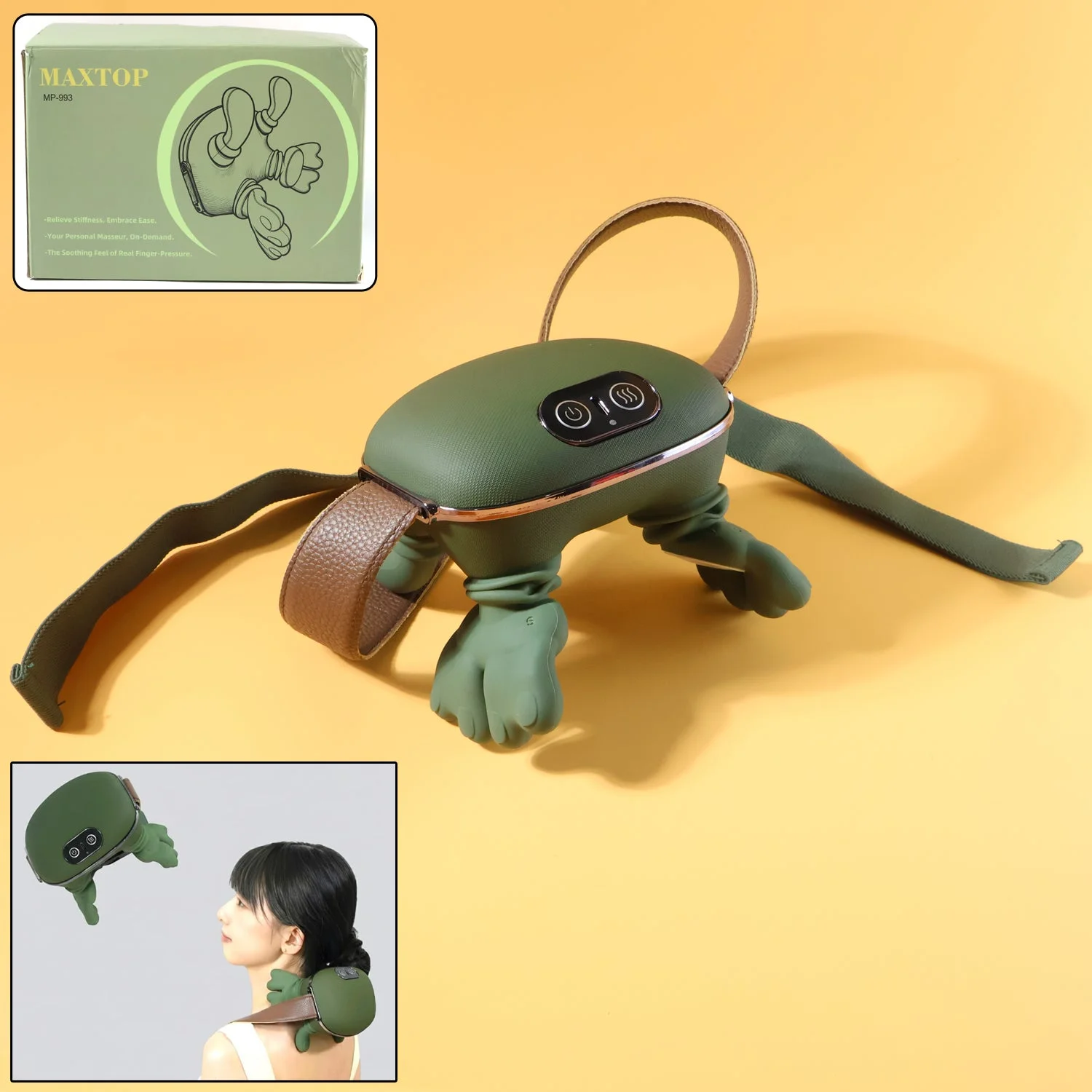 This advanced neck and shoulder massager is designed to deliver deep comfort through kneading, pressure-point stimulation and soothing heat therapy. Its flexible finger-shaped nodes replicate the sensation of a real massage, easing stiffness and relaxing tense muscles. The adjustable strap system allows you to secure it comfortably around the neck, shoulder, back, waist or legs for a perfectly targeted massage experience. With its ergonomic shape, simple control panel and lightweight construction, it is ideal for everyday relaxation at home, in the office or while traveling. The built-in heating mode enhances muscle relief, helping improve circulation and easing fatigue after long hours of work or travel. A reliable and portable relaxation device, it provides a rejuvenating experience whenever you need it.