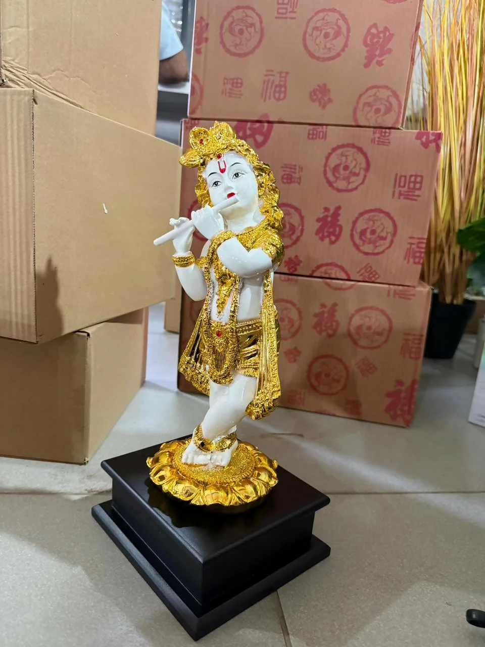 Bring divine grace and spiritual charm into your home with this beautifully crafted Lord Krishna idol playing the flute. Symbolizing love, peace, and devotion, this elegant statue features intricate detailing with a radiant golden finish that enhances its divine appearance. The graceful posture of Krishna playing the flute represents harmony and spiritual bliss. Mounted on a sturdy decorative base, this idol is perfect for home temples, pooja rooms, living rooms, offices, or meditation spaces. It also makes a thoughtful gift for Janmashtami, Diwali, housewarming ceremonies, weddings, and other religious celebrations.