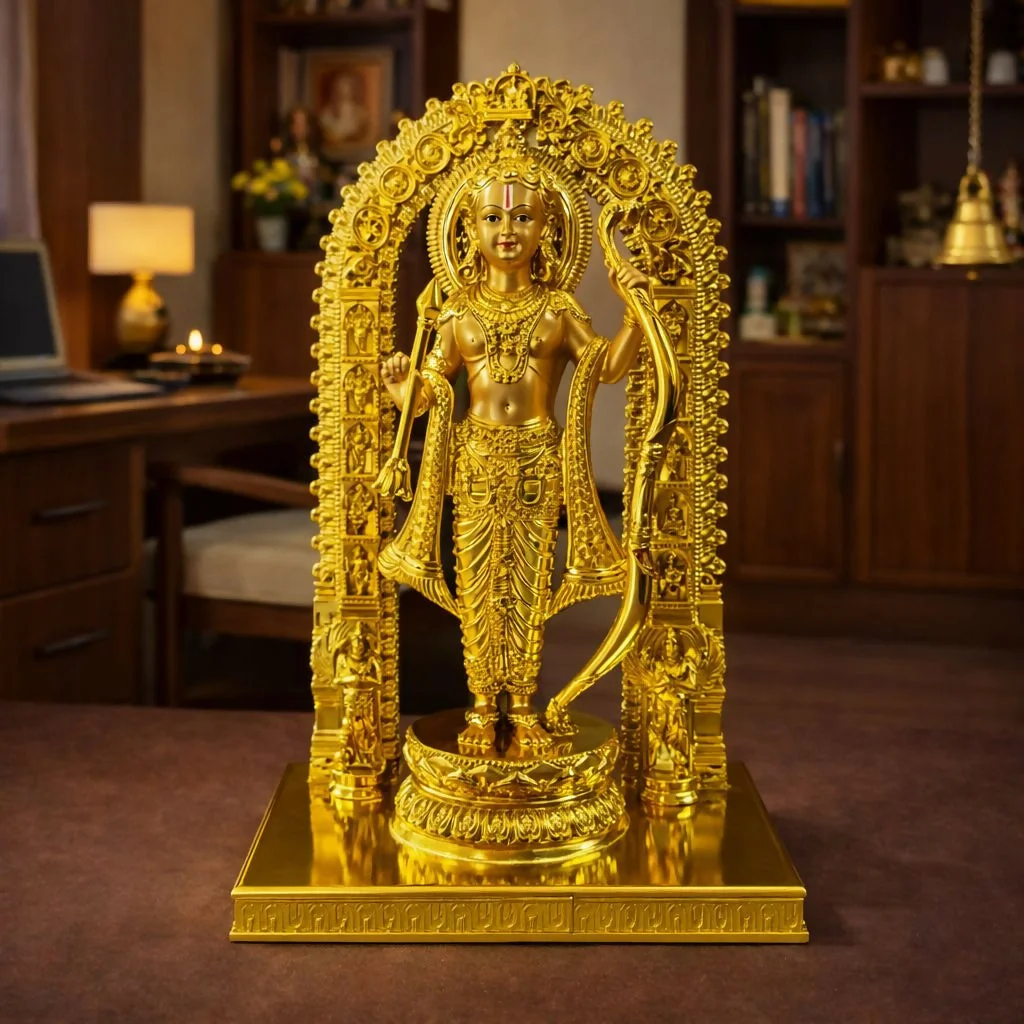 Bring divine blessings and spiritual strength to your home with this beautifully crafted Lord Ram idol holding a bow. Symbolizing righteousness, courage, and devotion, the statue features Lord Ram standing gracefully under a decorative arch with intricate traditional detailing. The radiant golden finish enhances its divine appearance, making it a perfect centerpiece for home temples, pooja rooms, living rooms, or offices. Mounted on a sturdy base, this elegant statue blends spiritual significance with artistic craftsmanship. It is ideal for daily worship, festive décor, and gifting on occasions like Ram Navami, Diwali, housewarming ceremonies, and religious celebrations.