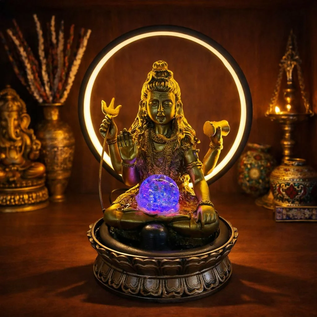 lord shiva fountain, LED shiva water fountain, halo ring light decor, pooja room fountain, spiritual tabletop fountain, home temple decor item, meditation water fountain, indoor decorative fountain, religious decor for home, shiva idol decor, festival gift item, LED fountain decor