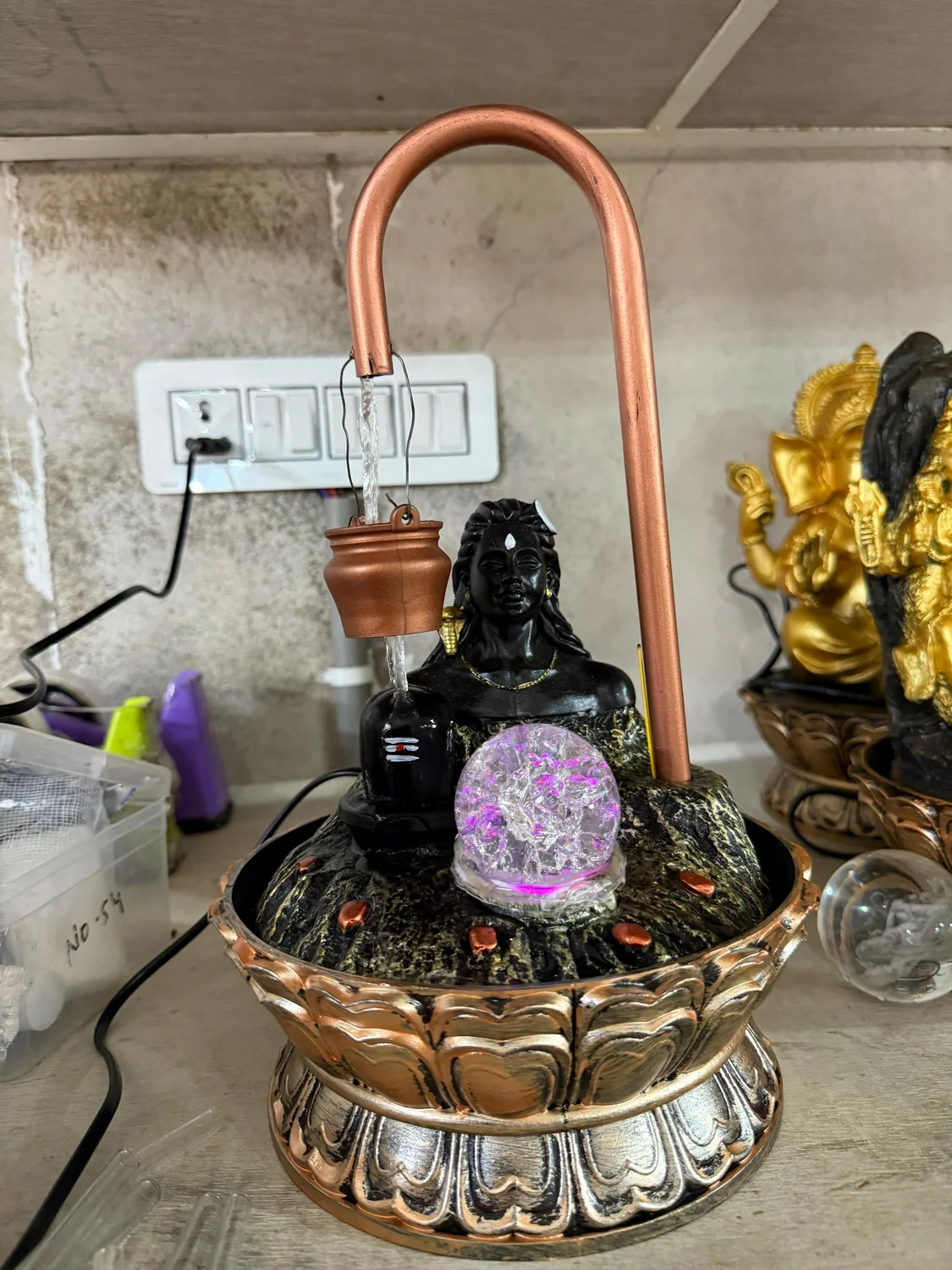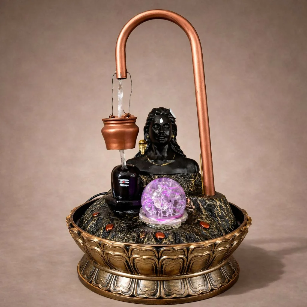 lord shiva fountain, shivling water fountain, shiva idol decor, pooja room fountain, spiritual tabletop fountain, LED water fountain, home temple decor, religious decor item, meditation water feature, indoor decorative fountain, festival gift item, devotional home decor