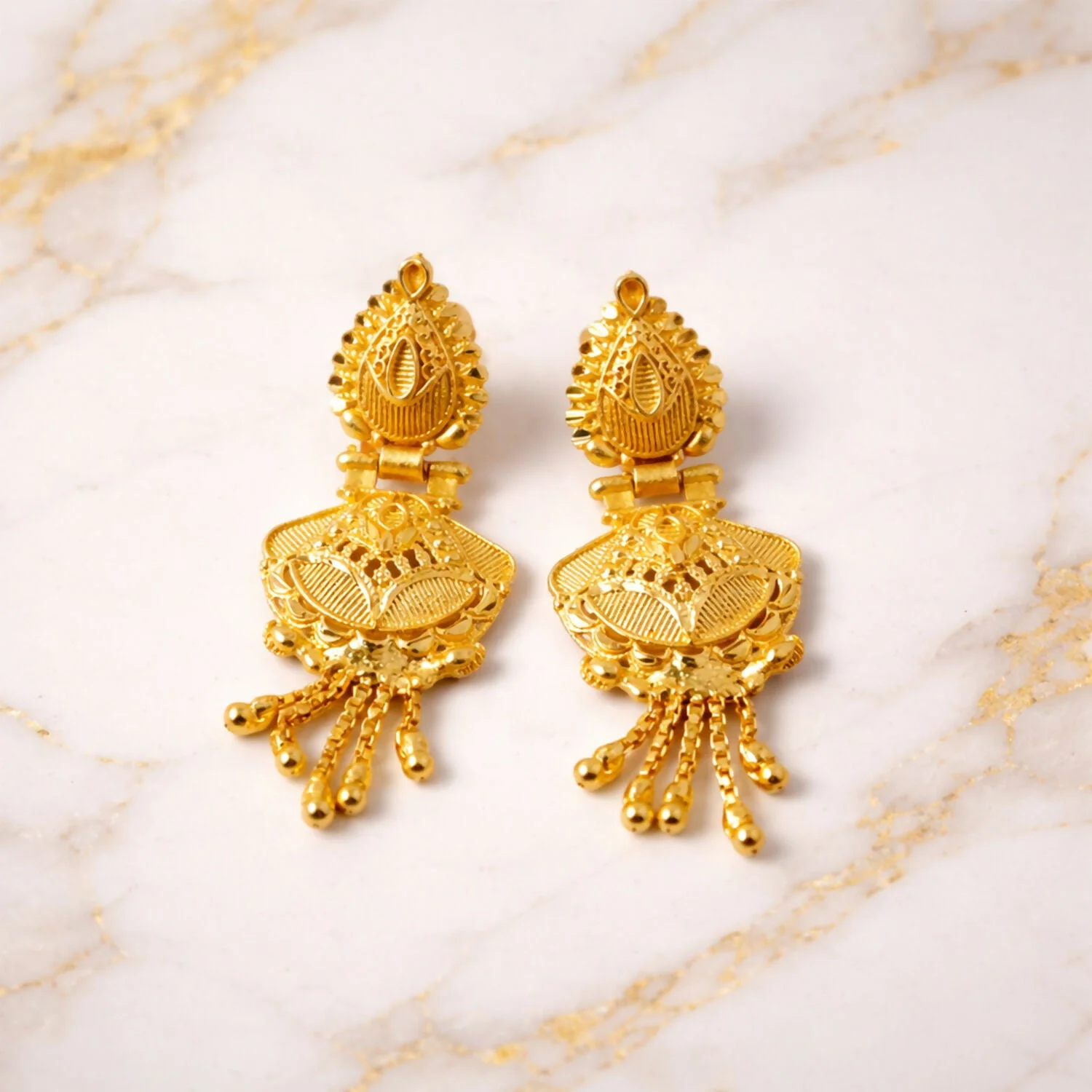 Elevate your traditional look with these exquisitely crafted gold earrings, designed to reflect timeless elegance and heritage artistry. Featuring an intricate leaf-inspired top stud, these earrings are beautifully adorned with delicate filigree detailing and fine engraved textures that showcase exceptional craftsmanship.