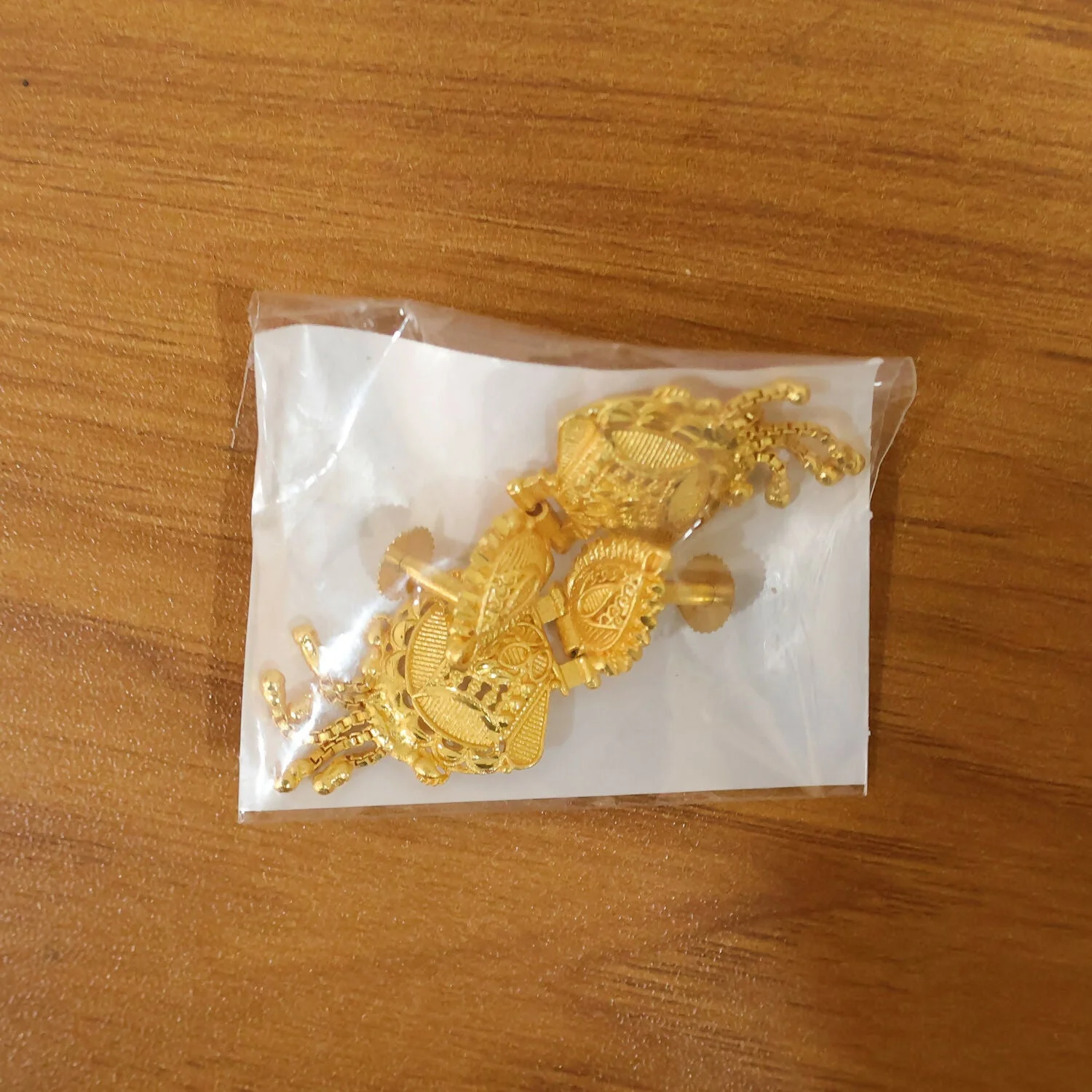 The centerpiece displays an ornate lattice pattern, enhanced with symmetrical carvings that create depth and dimension. The lower section is gracefully finished with multiple dangling gold bead tassels, adding fluid movement and a soft, melodious sway with every step. This dynamic design captures light beautifully, creating a radiant glow that enhances your overall appearance.