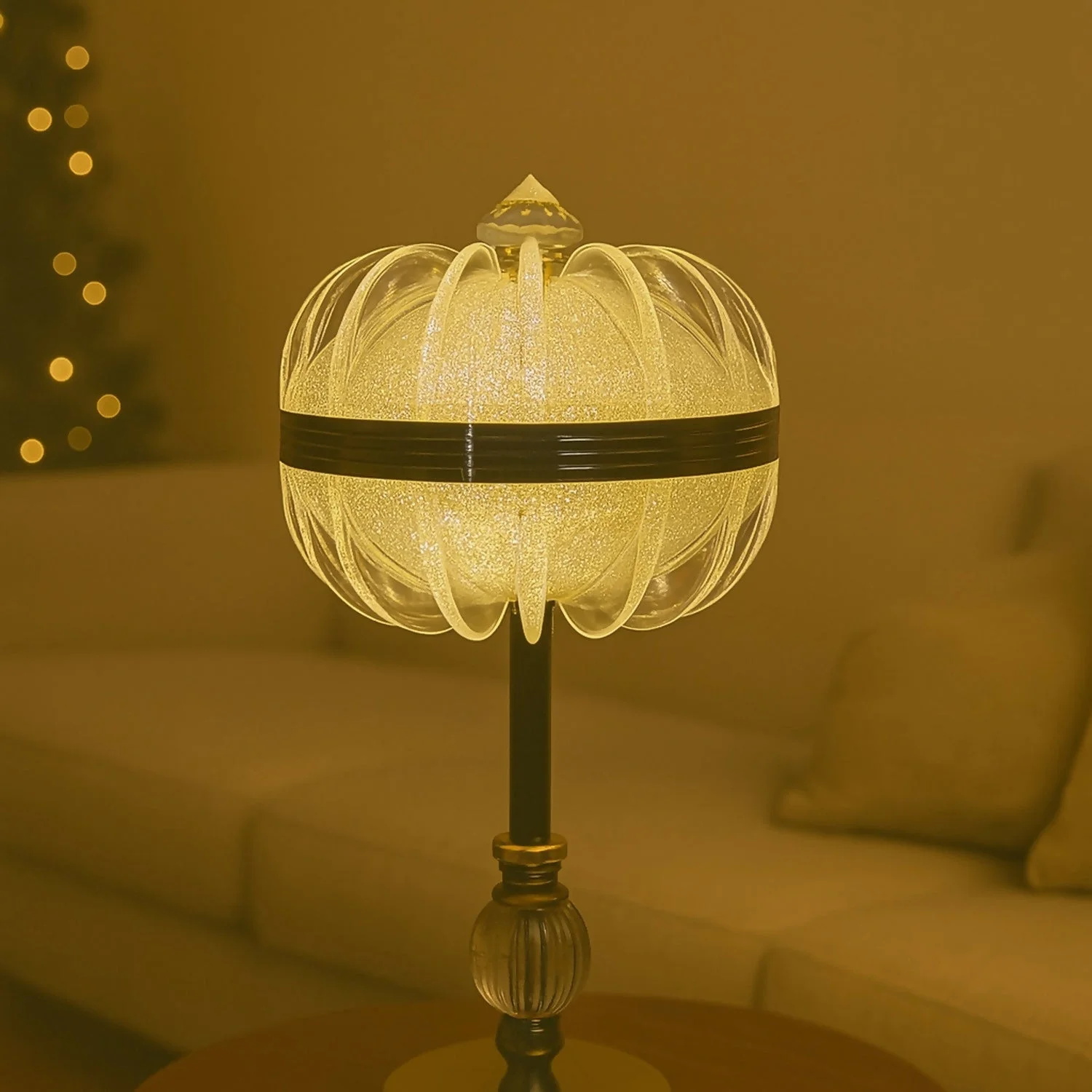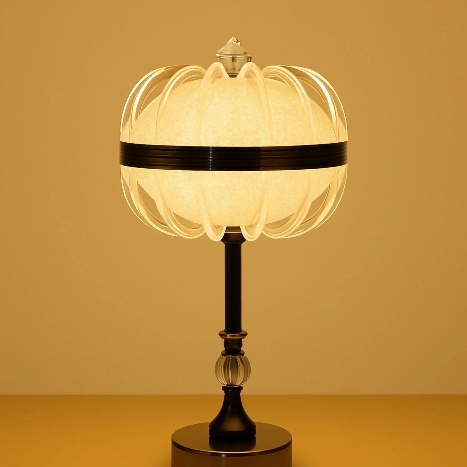 crystal table lamp, luxury home decor lamp, warm light lamp, premium bedside lamp, bedroom night lamp, decorative LED lamp, swirl cage lamp, living room table lamp, ambient light lamp, hotel style lamp, golden glow lamp, modern home decoration light, designer table lamp, crystal globe lamp.