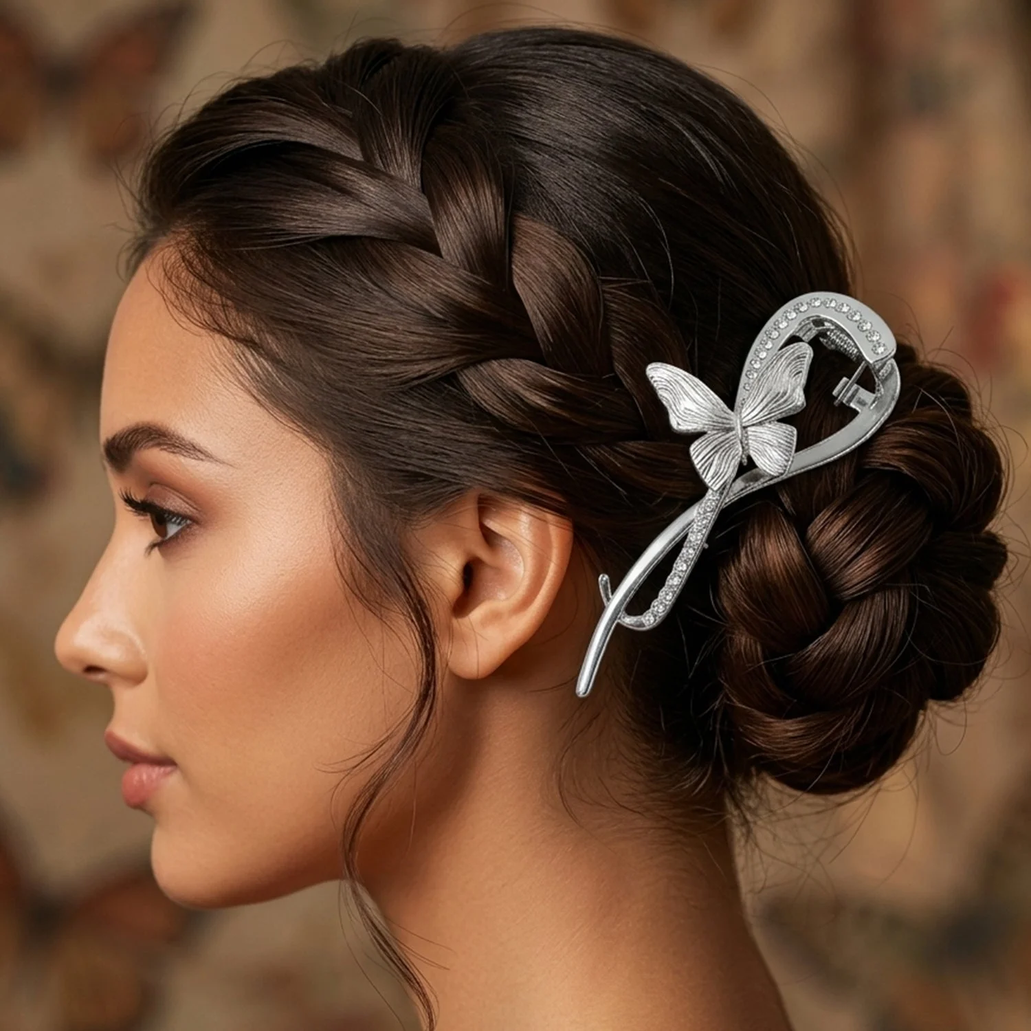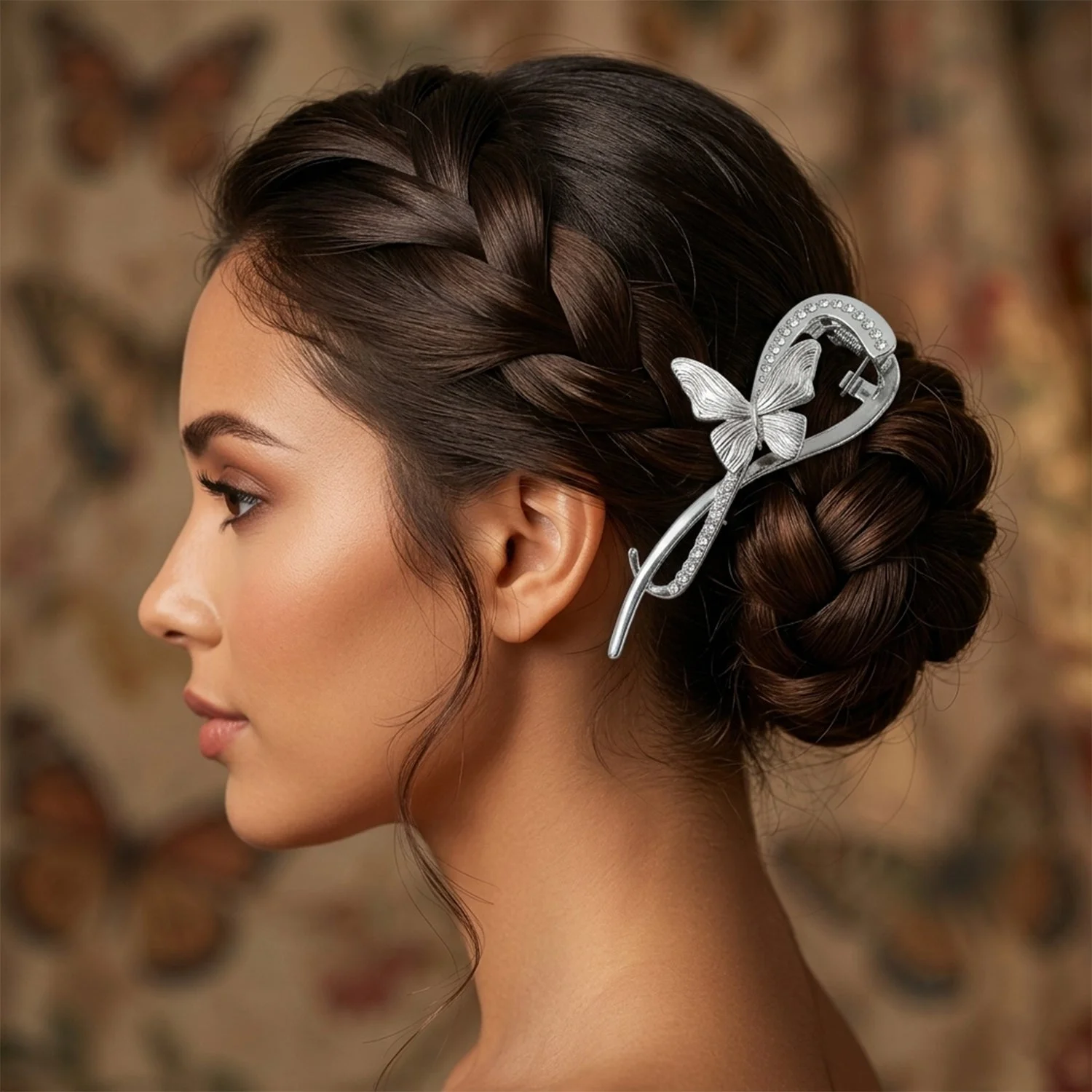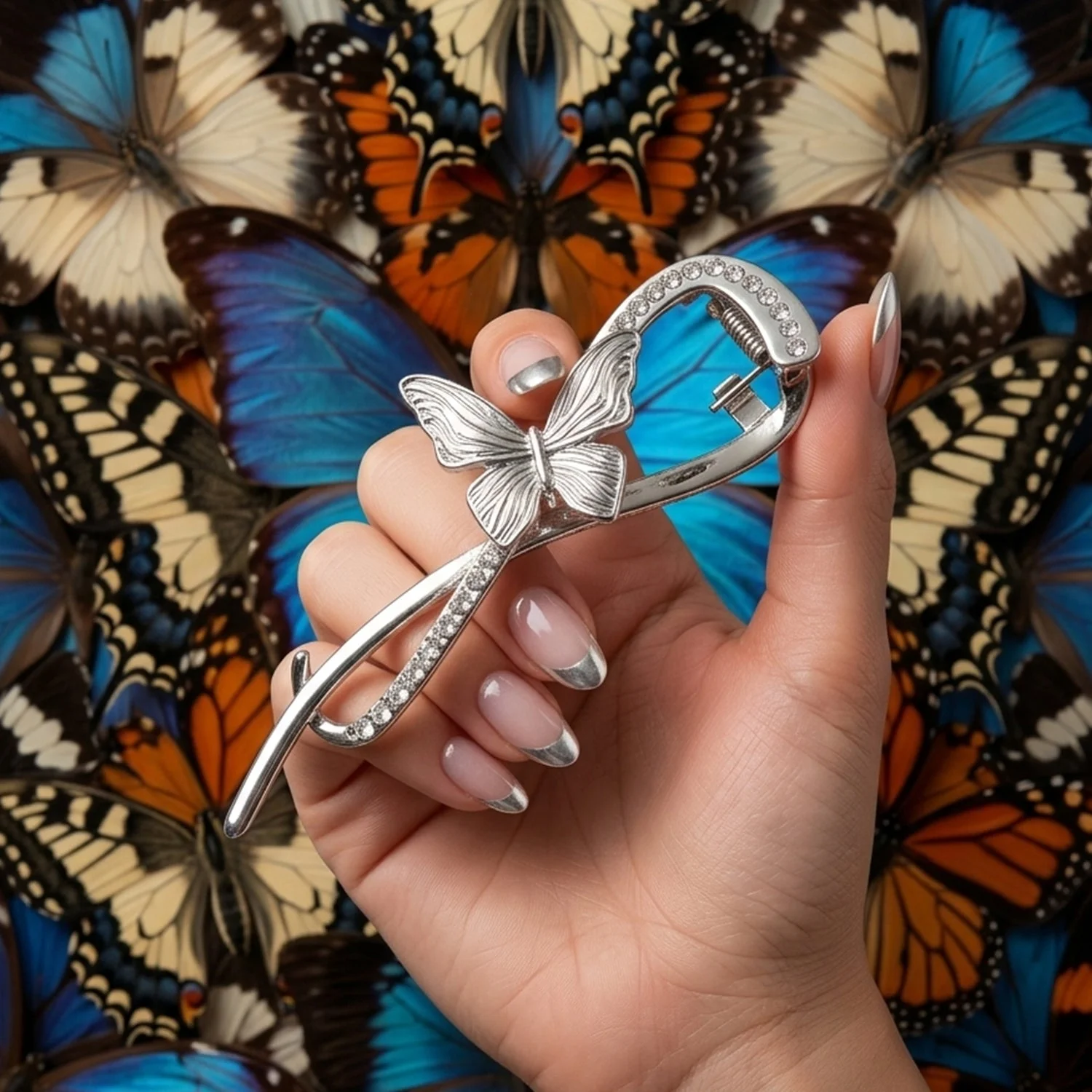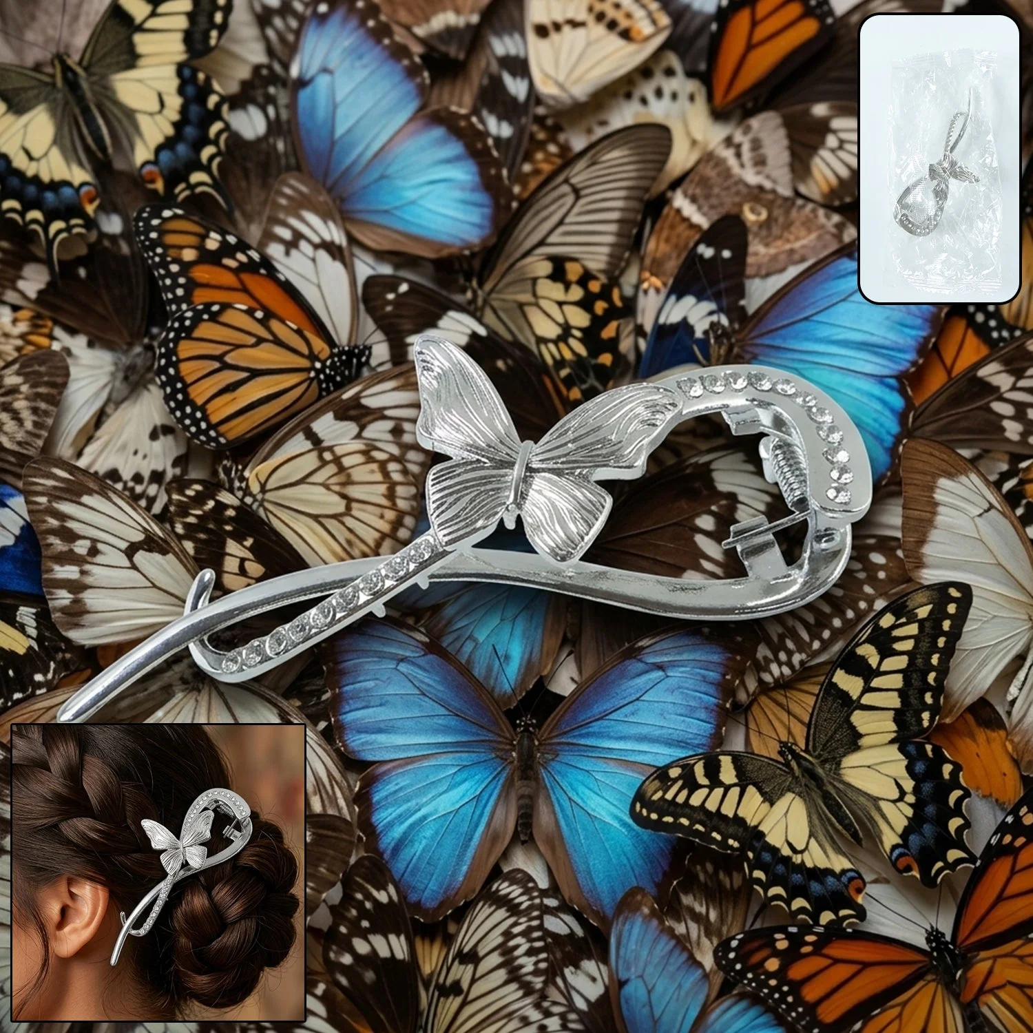 Enhance your hairstyle with this beautifully designed butterfly hair clip that combines elegance with functionality. Crafted with a sleek metal finish and adorned with delicate crystal accents, this clip adds a graceful charm to any look. The unique butterfly design creates a stylish statement, making it perfect for both casual and special occasions. It offers a firm grip to hold your hair securely without slipping. Whether you're styling a bun, braid, or side clip, this accessory effortlessly elevates your overall appearance.