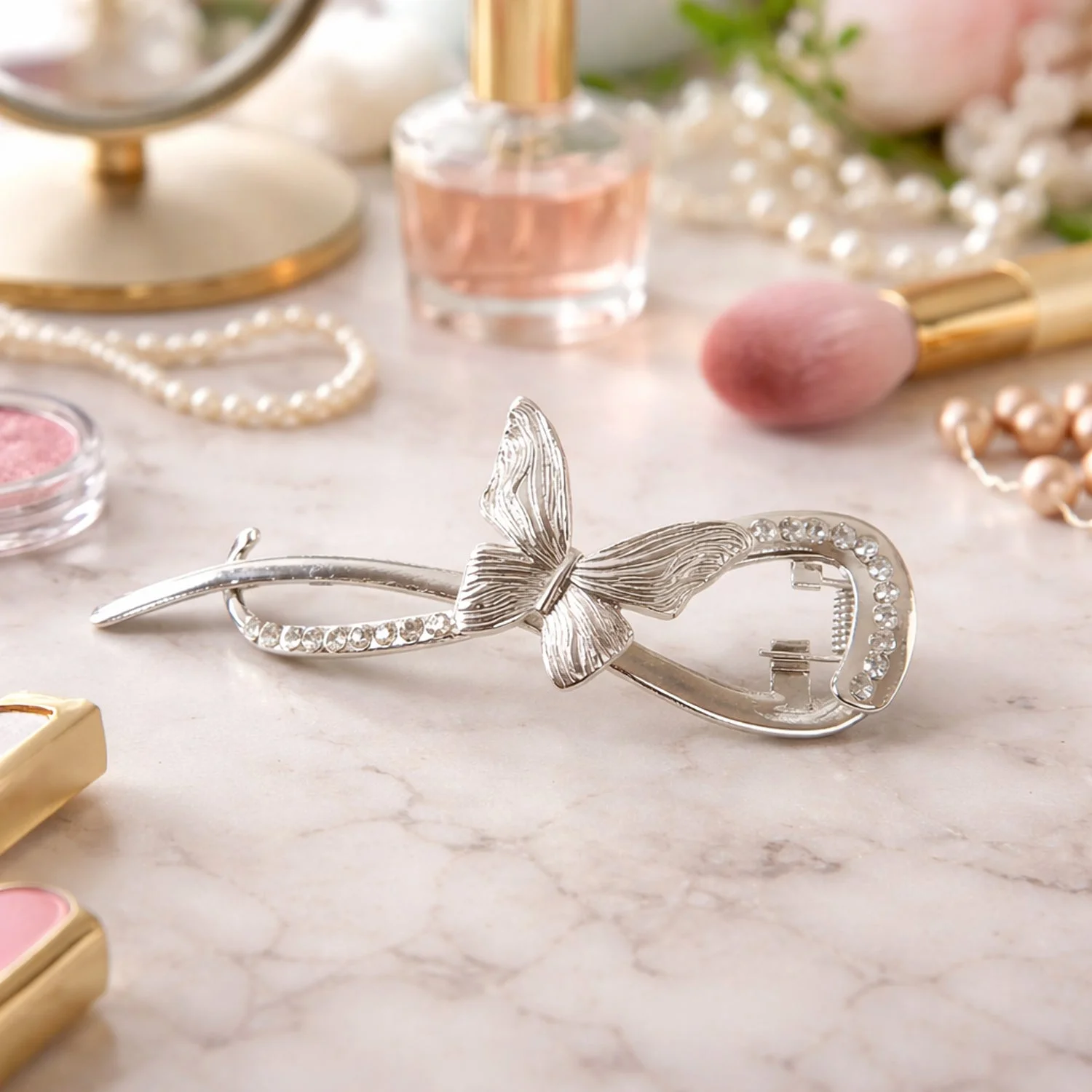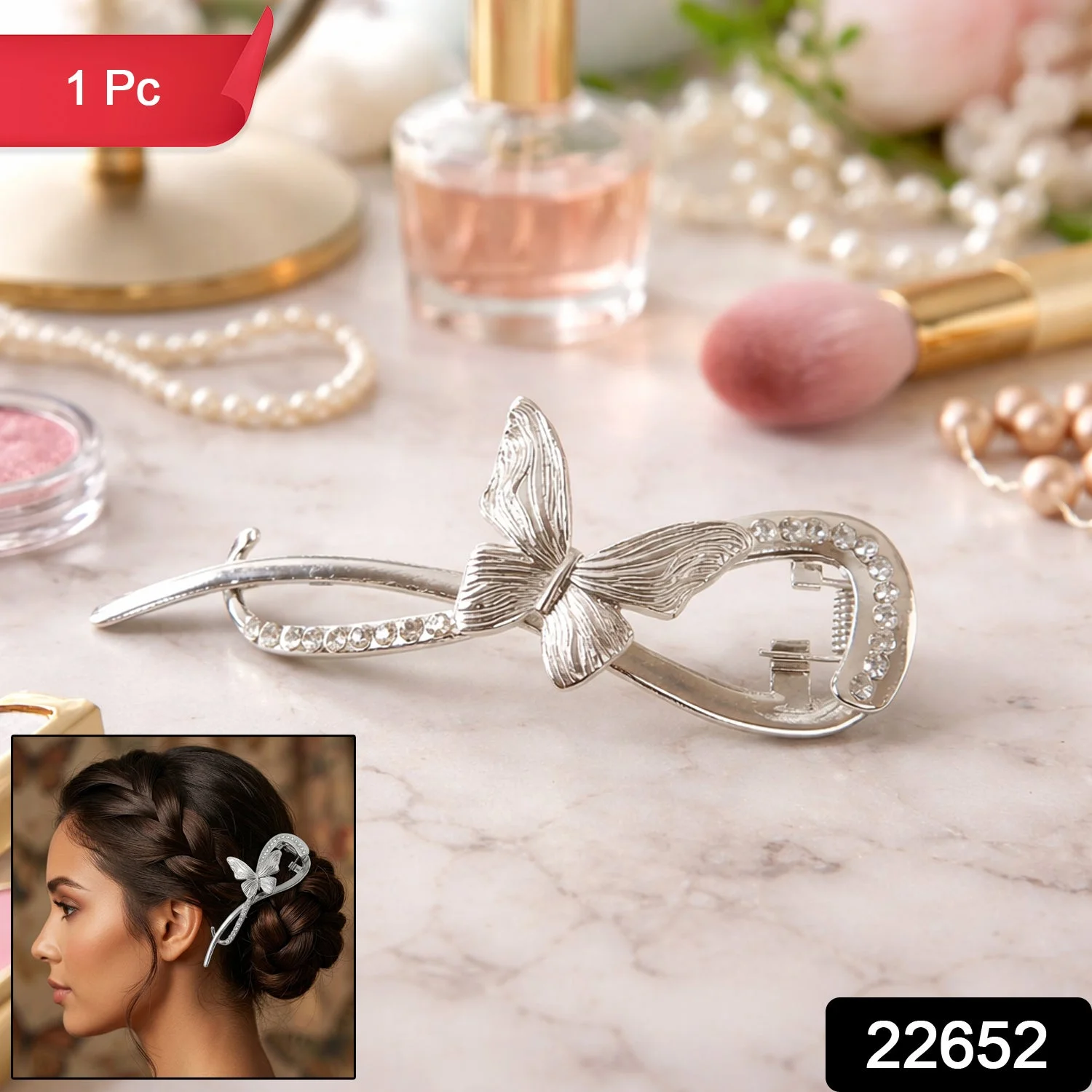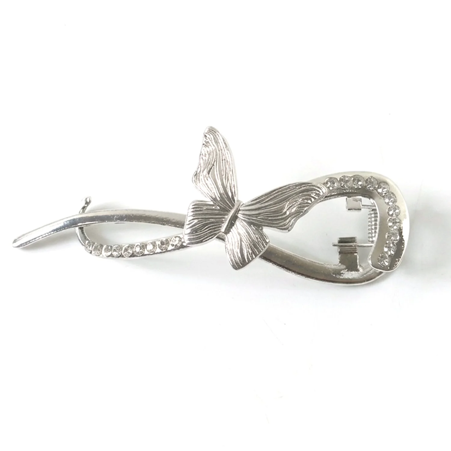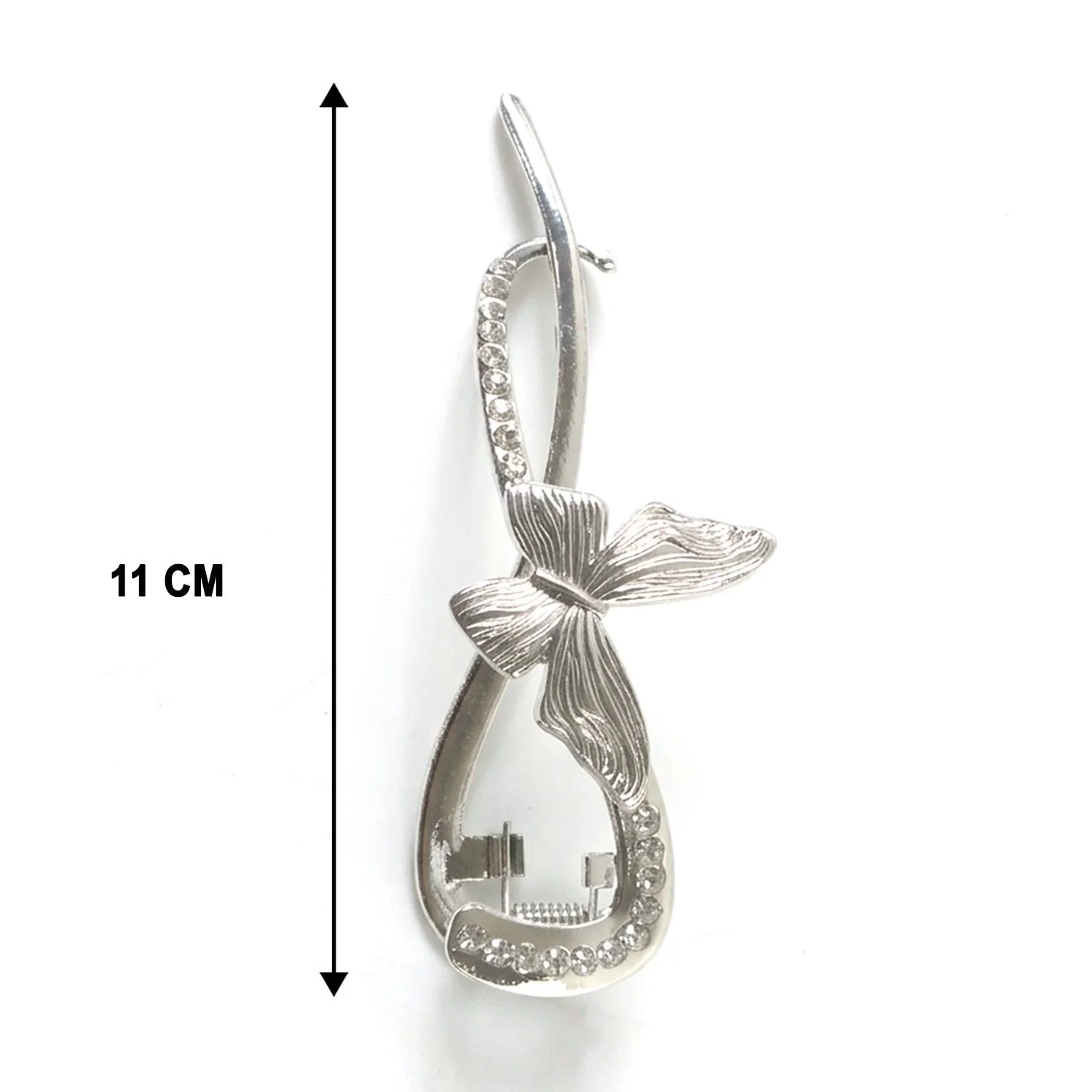 Enhance your hairstyle with this beautifully designed butterfly hair clip that combines elegance with functionality. Crafted with a sleek metal finish and adorned with delicate crystal accents, this clip adds a graceful charm to any look. The unique butterfly design creates a stylish statement, making it perfect for both casual and special occasions. It offers a firm grip to hold your hair securely without slipping. Whether you're styling a bun, braid, or side clip, this accessory effortlessly elevates your overall appearance.