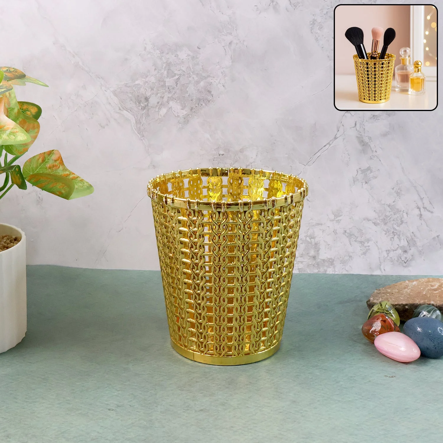 Add a touch of luxury and organization to your space with this exquisite Golden Decorative Holder. Crafted with intricate lattice-style detailing and a radiant gold finish, this versatile organizer doubles as a makeup brush holder, pen stand, or desktop storage cup. Its premium design elevates the look of your dressing table, vanity setup, or work desk while keeping your essentials neatly arranged. The sturdy structure ensures durability, while the open-top design allows easy access to brushes, pens, or accessories. Ideal for both decorative and functional use, this golden holder brings elegance and order to any environment.