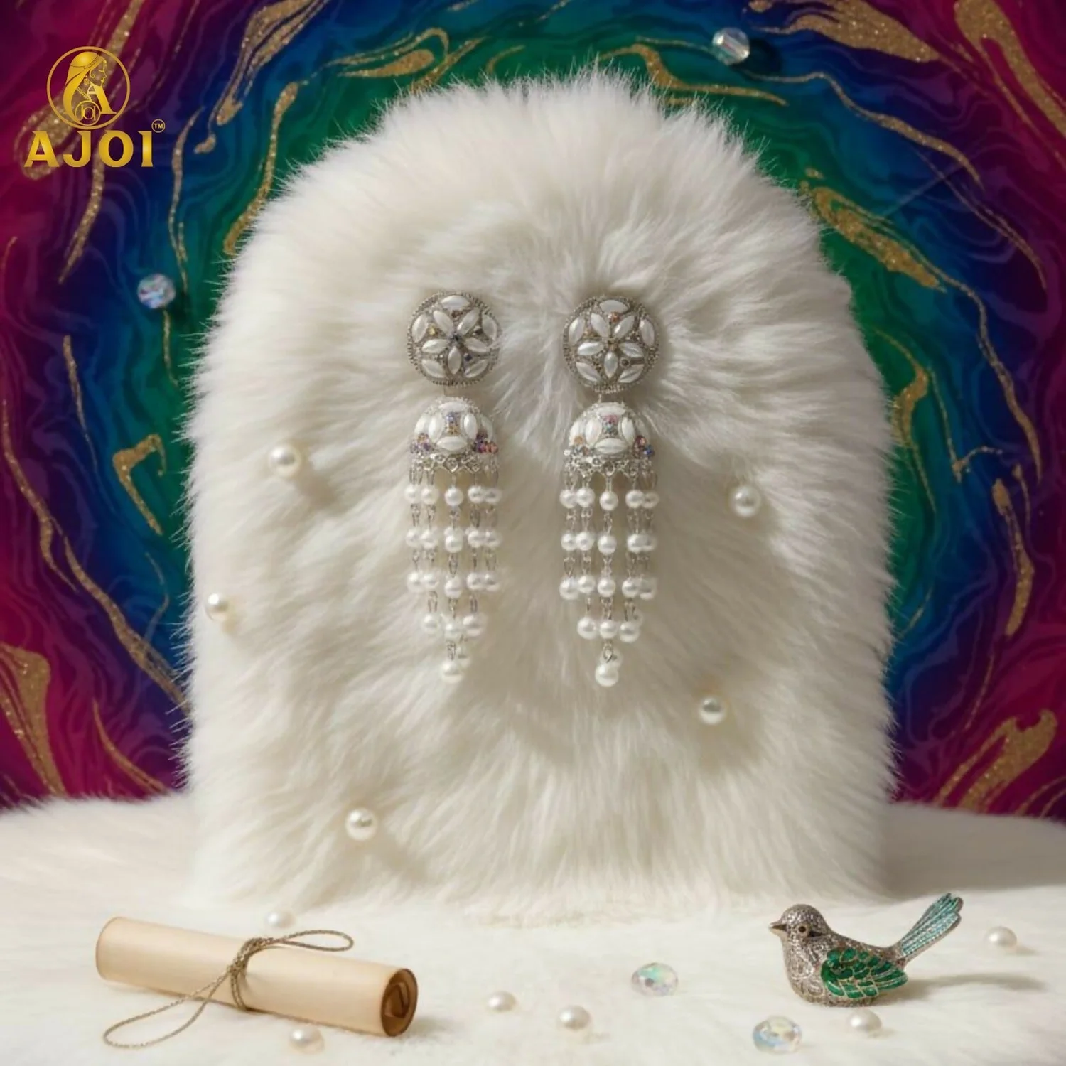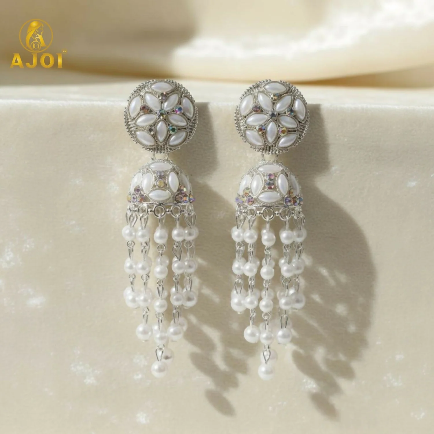 Elevate your elegance with these exquisitely crafted luxury pearl cascade jhumka earrings, designed to reflect timeless sophistication and graceful movement. The upper stud features a beautifully detailed floral motif, delicately adorned with marquise-shaped pearl accents and fine crystal detailing, creating a refined and luminous appearance.