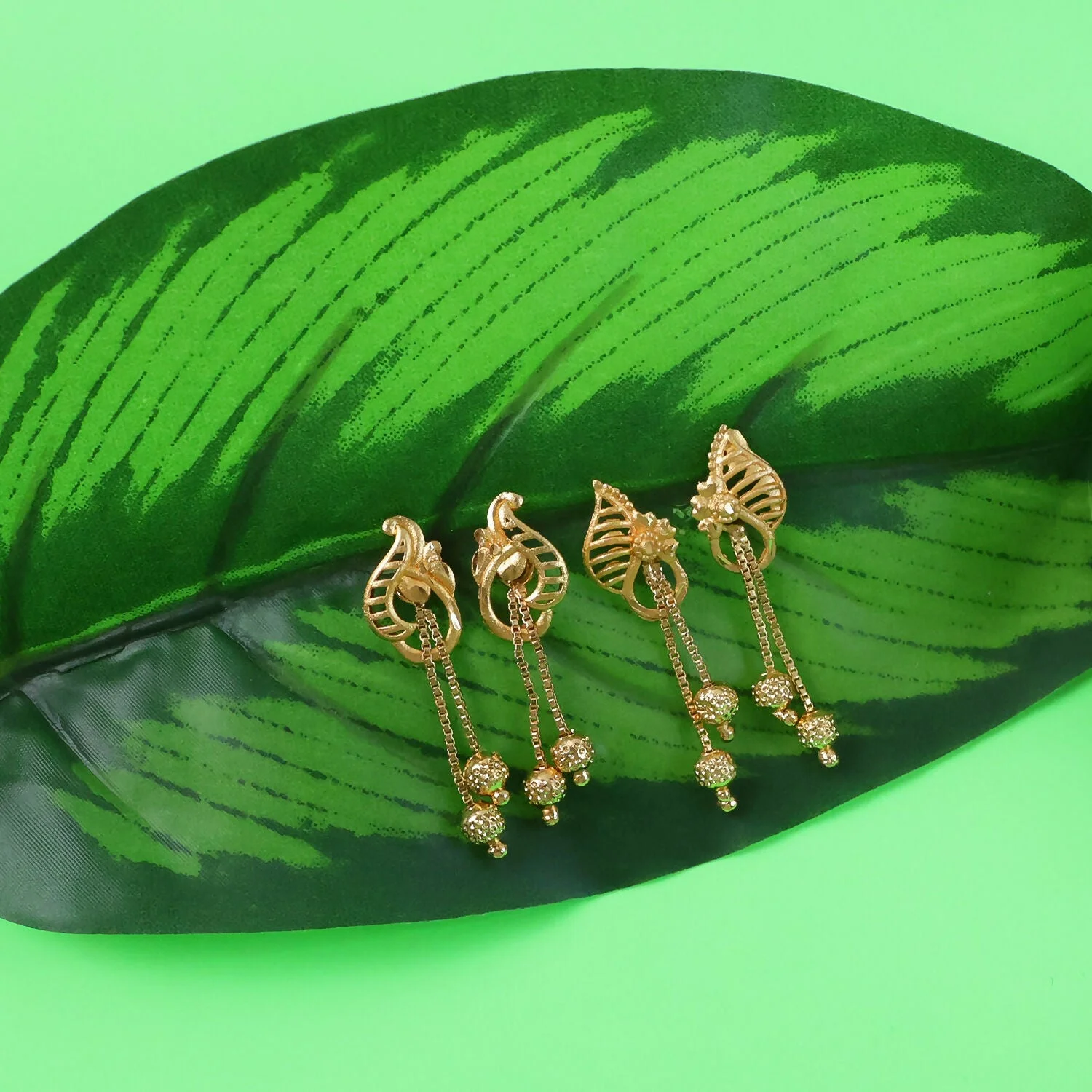 Designed with a premium matte gold finish, these earrings offer a luxurious appearance while remaining lightweight and comfortable for all-day wear. The combination of intricate patterns and charming bead drops makes this set versatile enough to pair with both traditional and modern outfits.