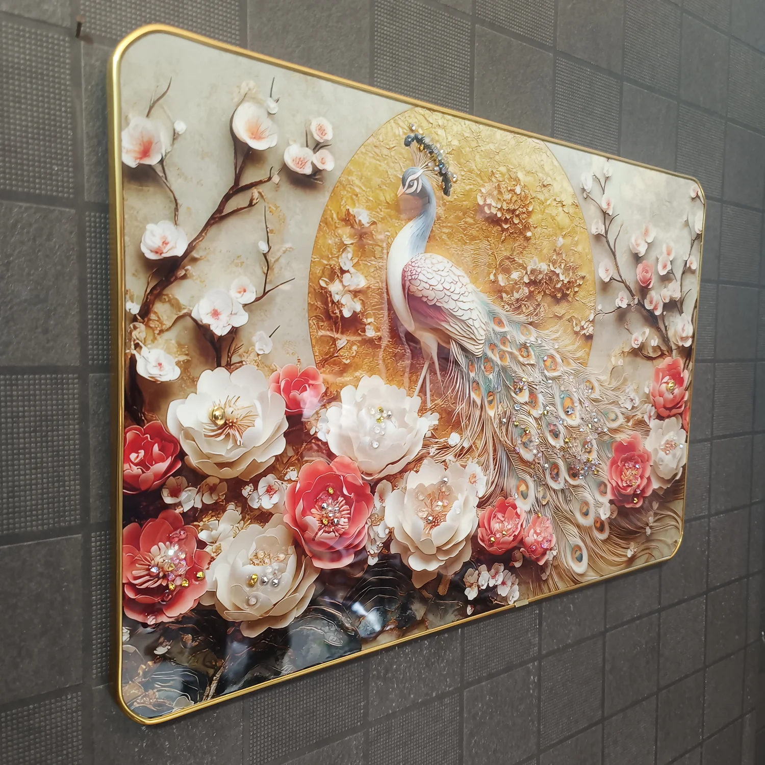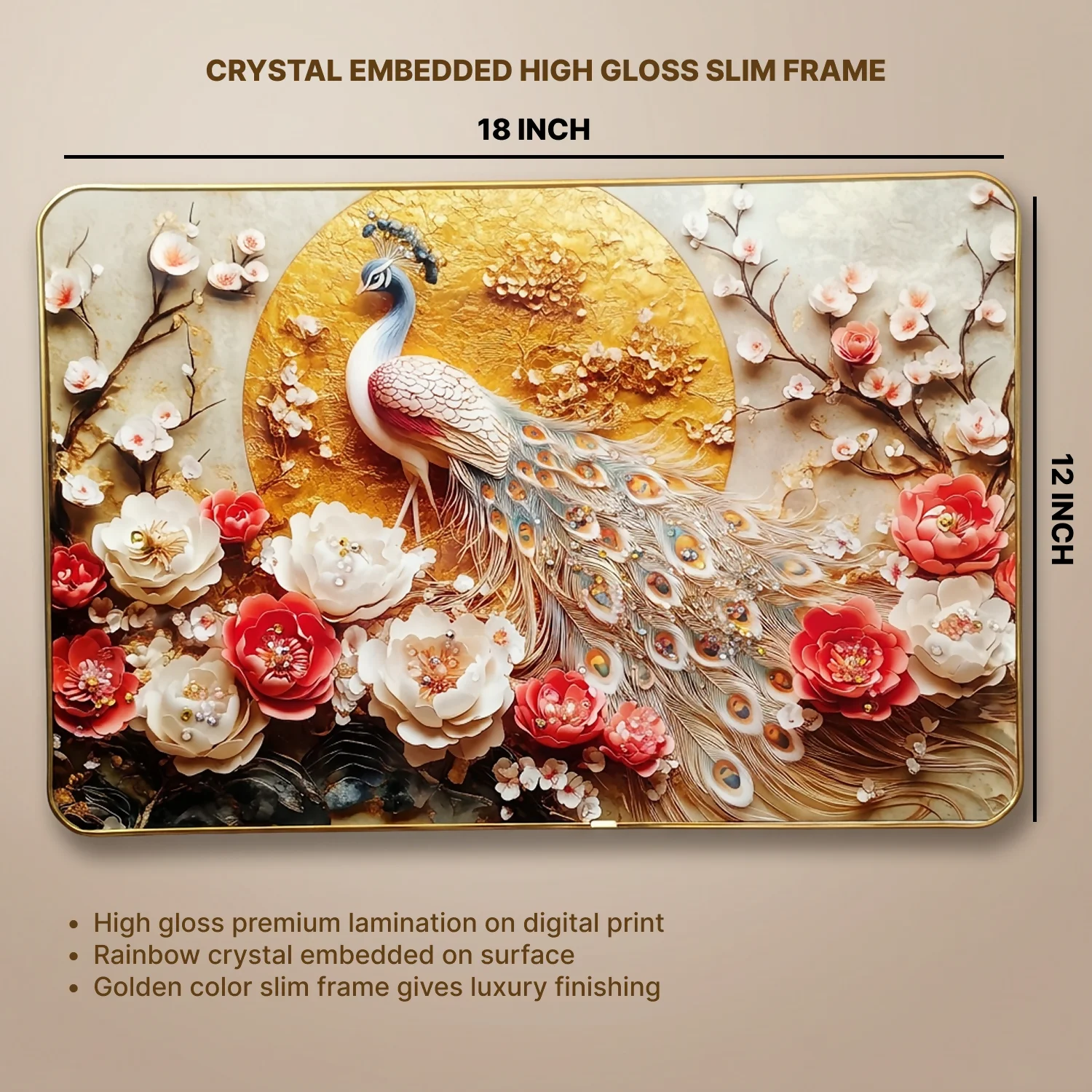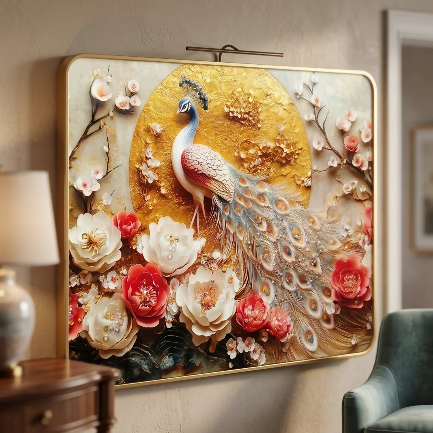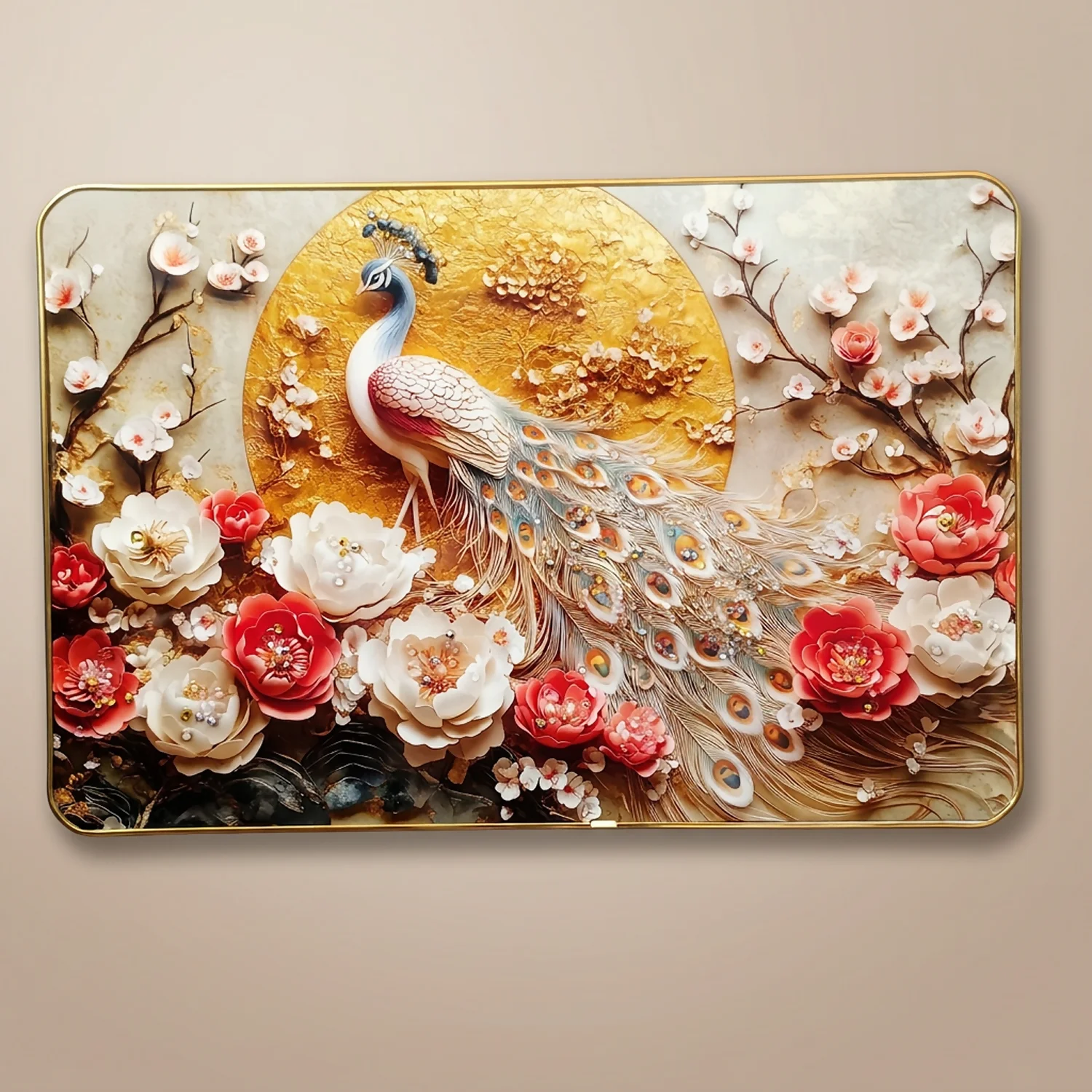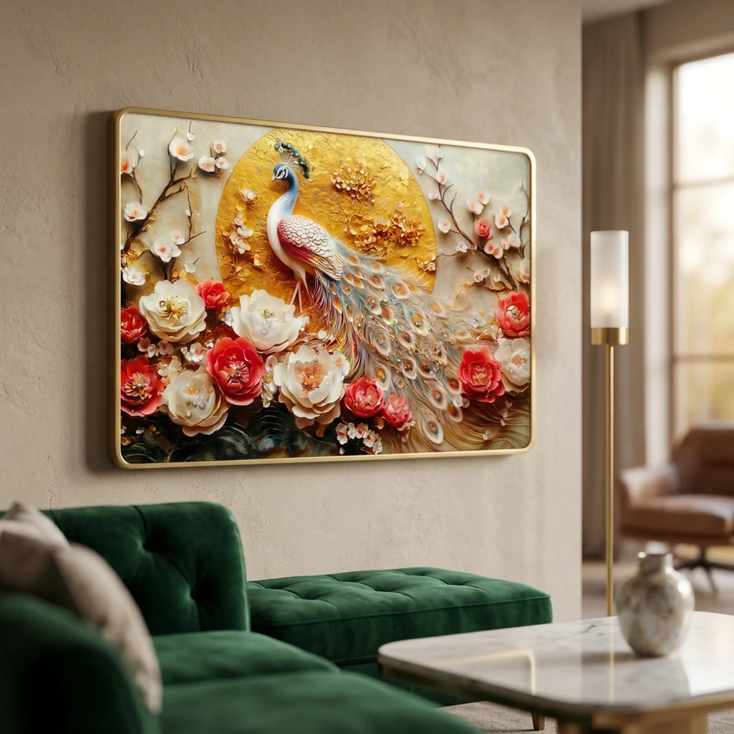 Add elegance, beauty, and prosperity to your interiors with this Luxury Peacock Wall Art Frame. Featuring a majestic peacock surrounded by blooming flowers and a radiant golden backdrop, this artwork symbolizes grace, positivity, abundance, and royal charm.