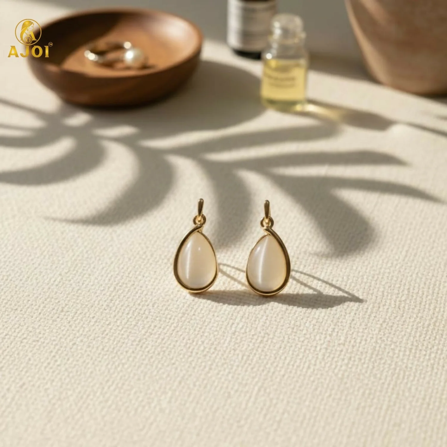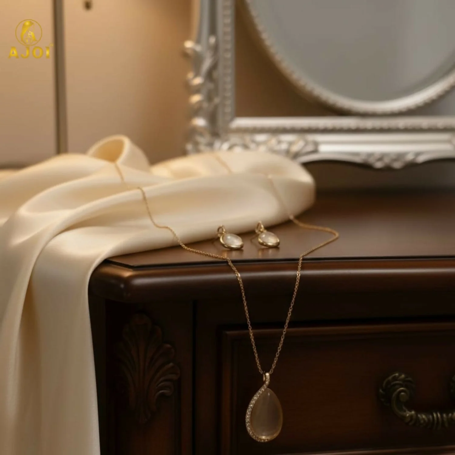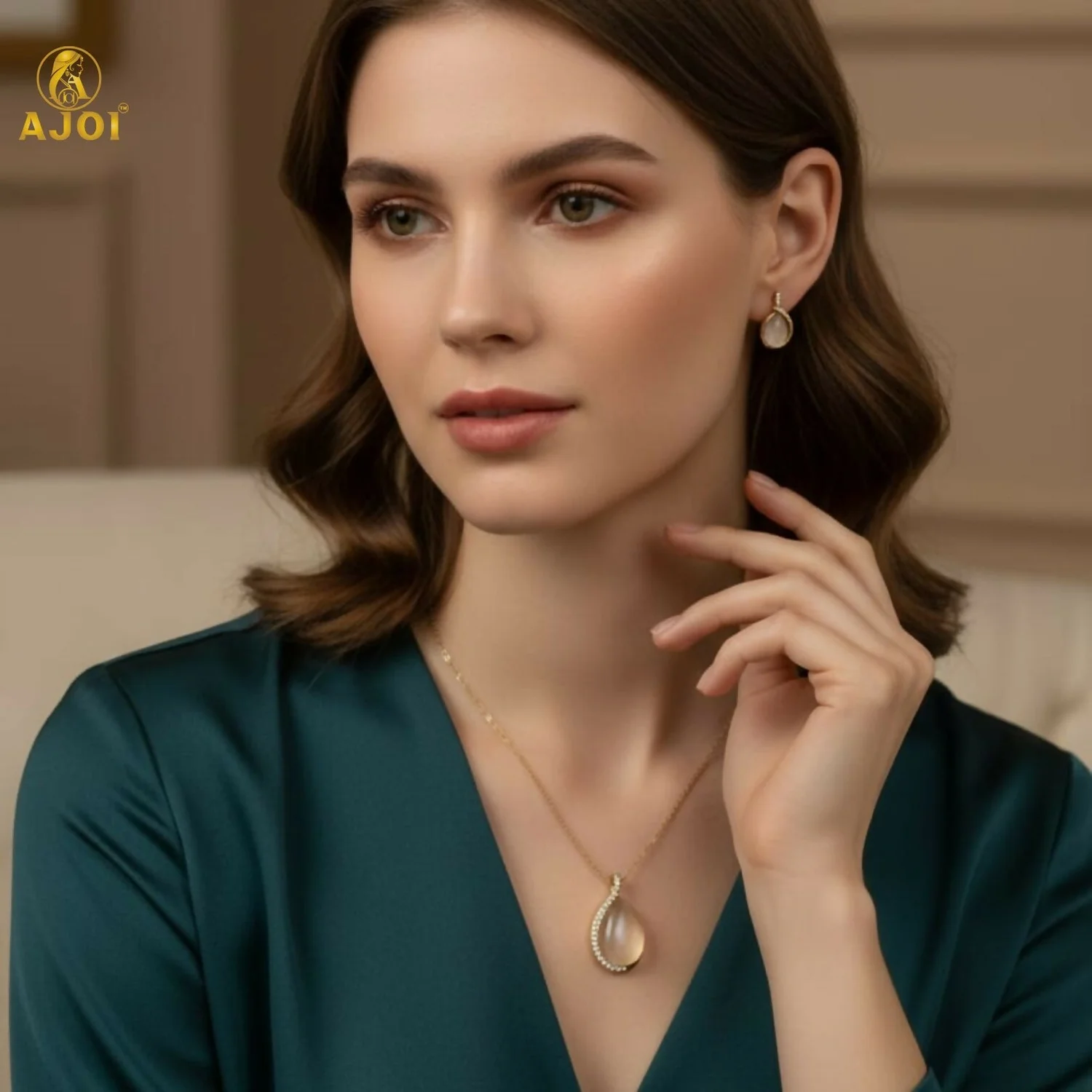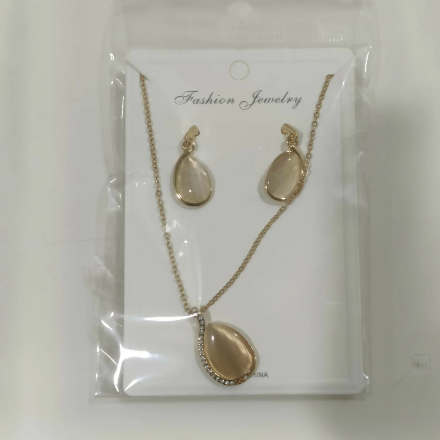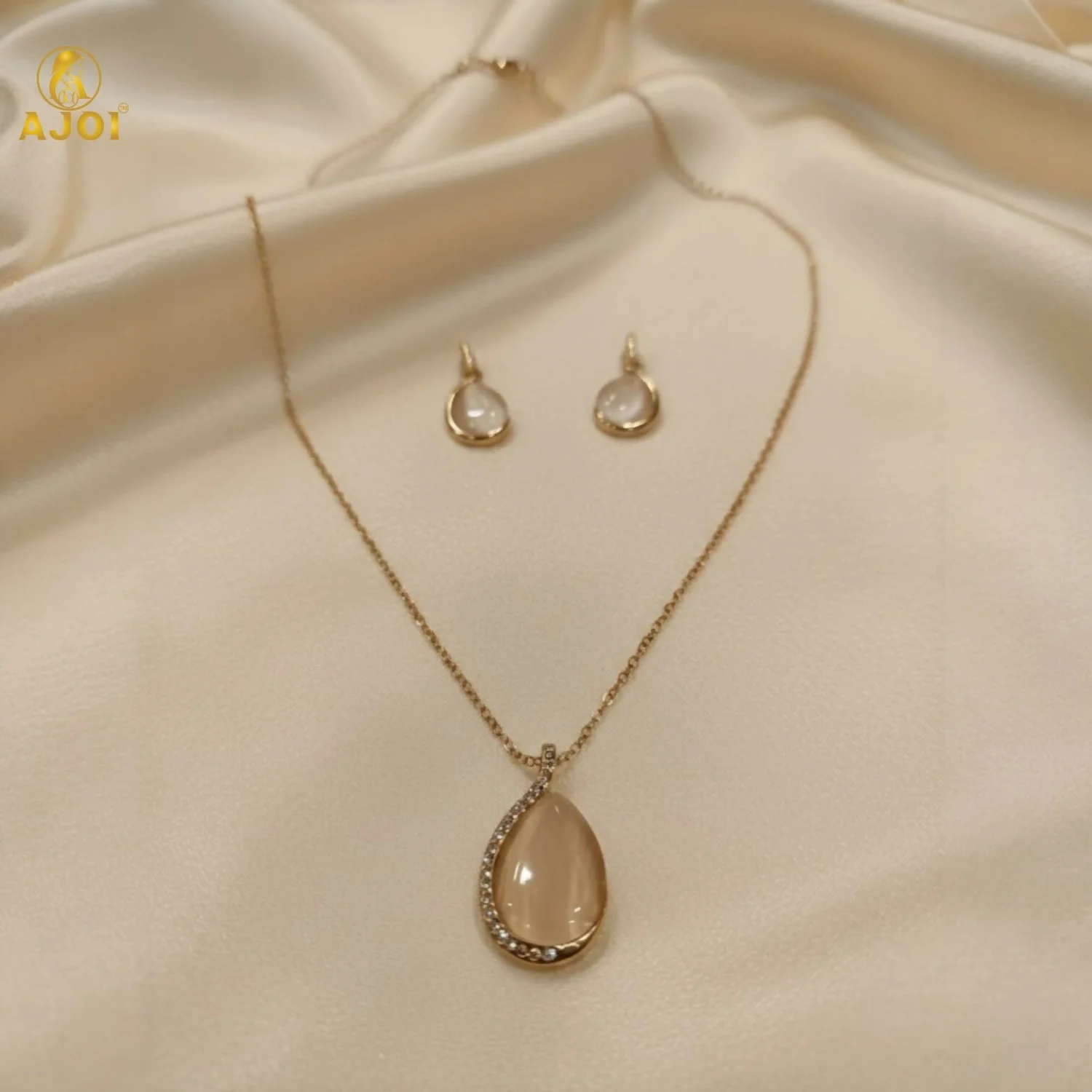 Indulge in timeless sophistication with this luxury rose gold-plated teardrop pendant set, designed to exude understated elegance. Featuring a smooth, luminous teardrop stone framed with delicate crystal accents, this pendant rests gracefully on a fine chain, perfectly complemented by matching stud earrings.