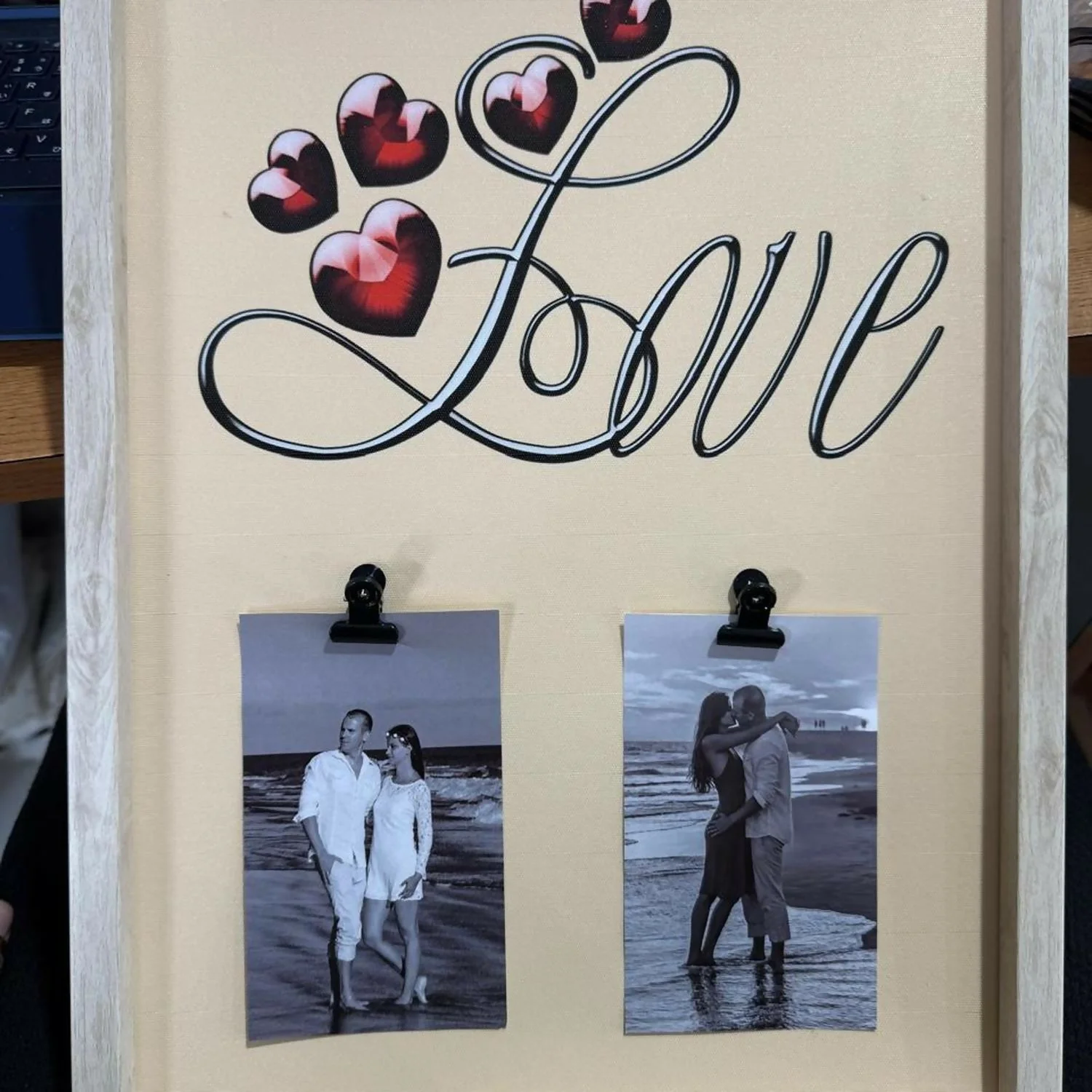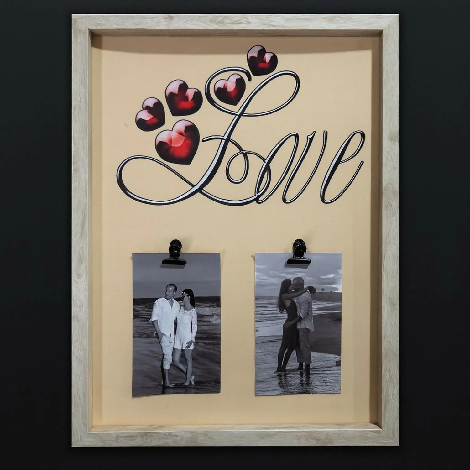 love photo frame wall hanging, wooden love photo frame, couple photo frame gift, anniversary photo frame, valentine’s day gift for couples, wall photo frame with clips, love design frame for bedroom, romantic photo frame wall décor, luxury wooden picture frame