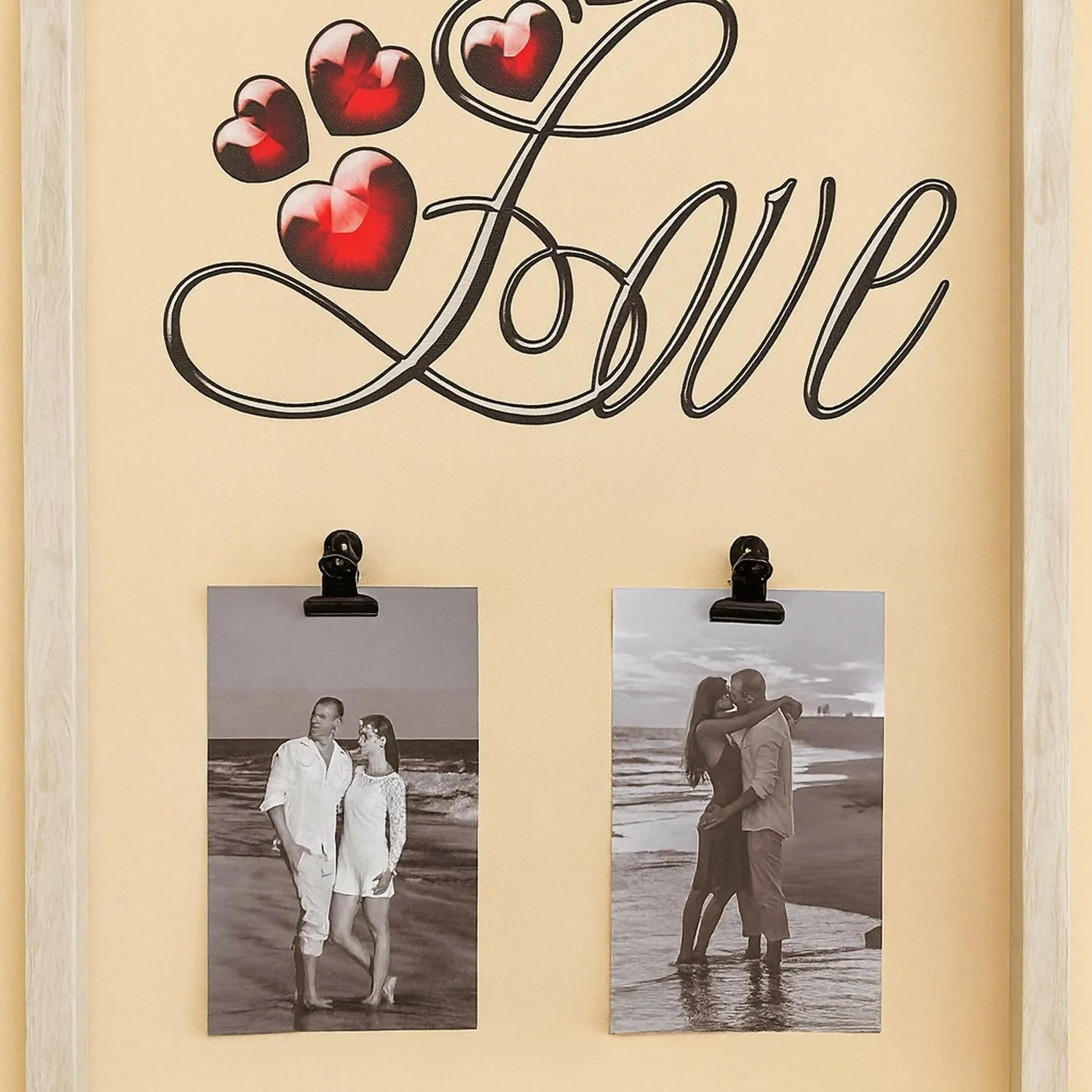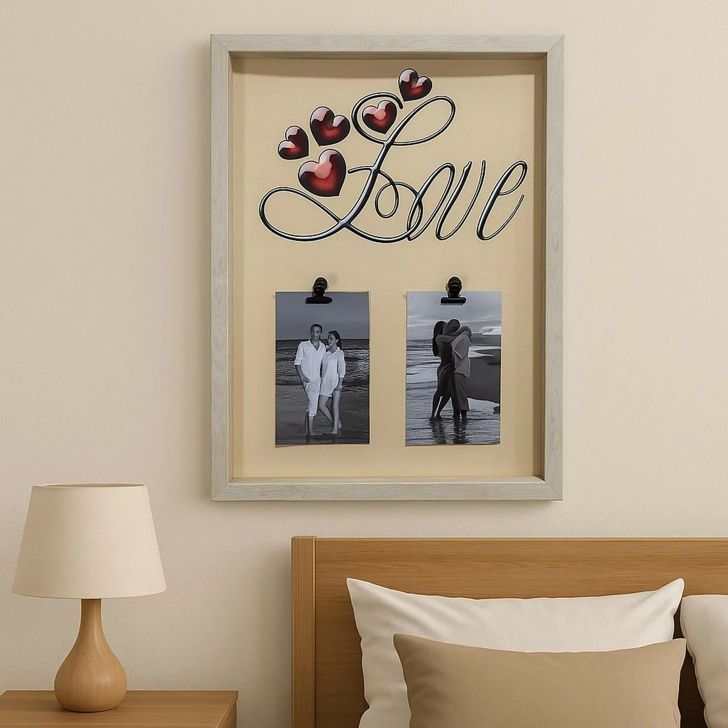 Elegant Design: Stylish wooden look frame with “Love” text and heart accents for a romantic touch.