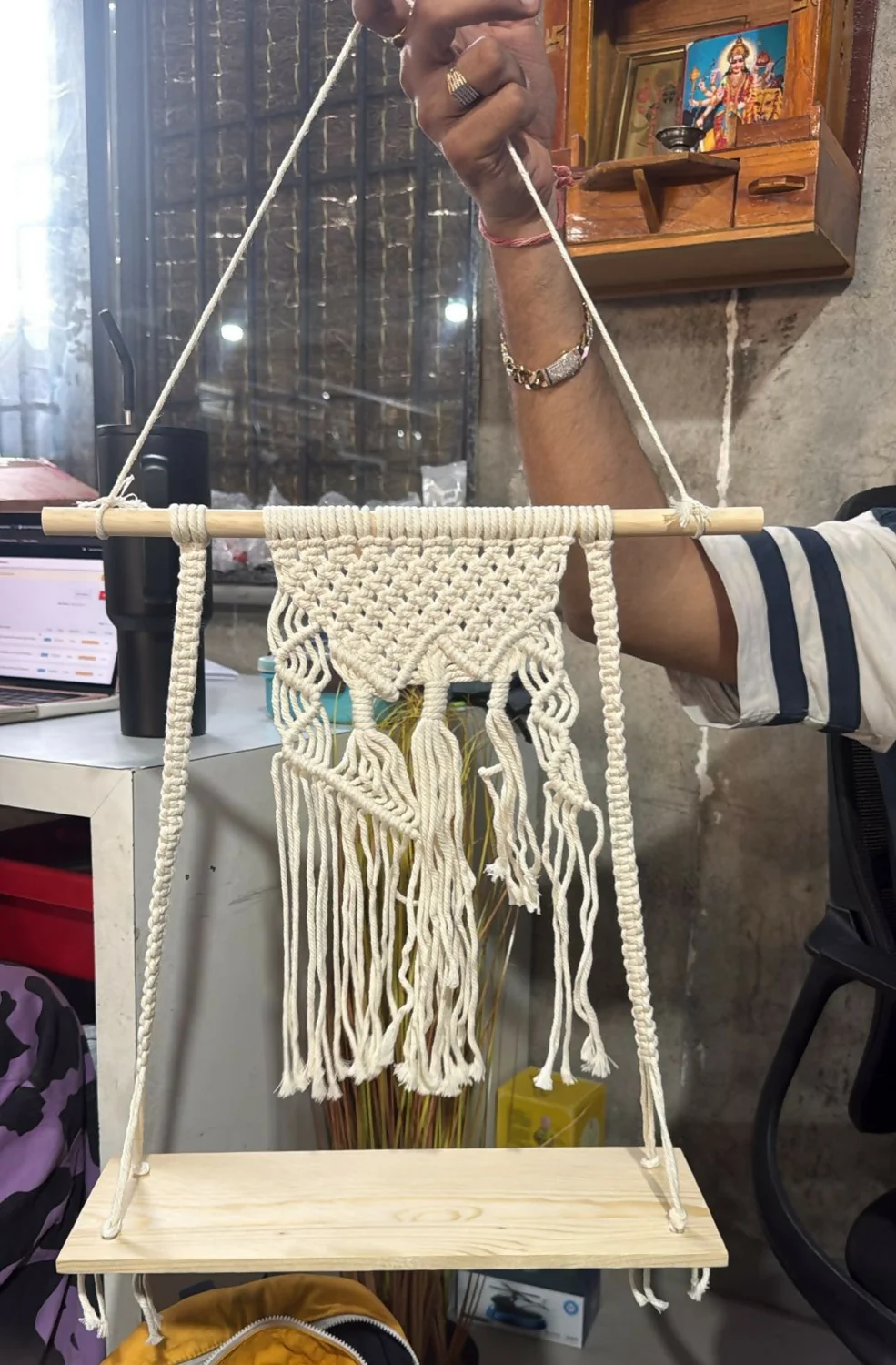 macrame wall shelf, macrame hanging shelf, wooden hanging shelf, boho wall décor shelf, rope hanging shelf, decorative wall shelf, macrame plant shelf, wall hanging display rack, wooden rope shelf, bohemian wall décor, hanging décor shelf, plant display shelf, macrame décor shelf, handmade wall shelf, home décor wall hanging