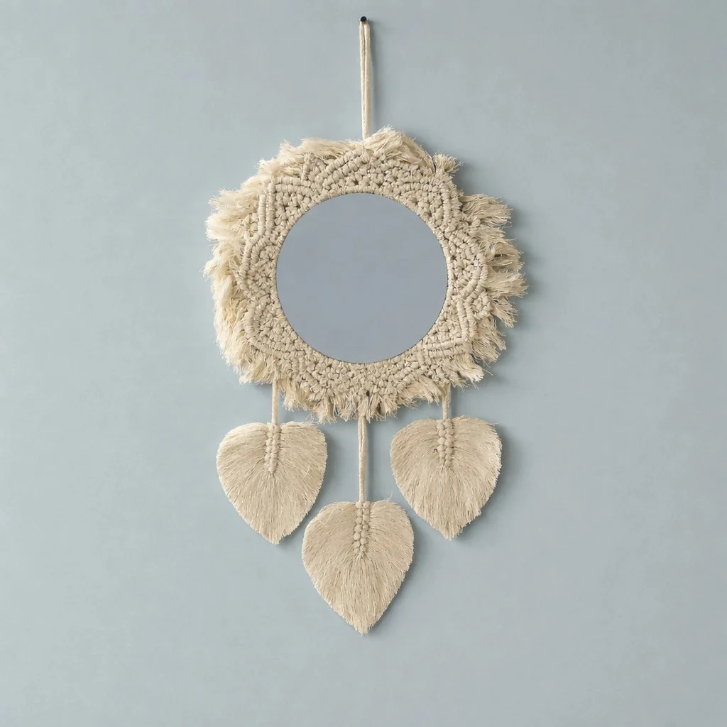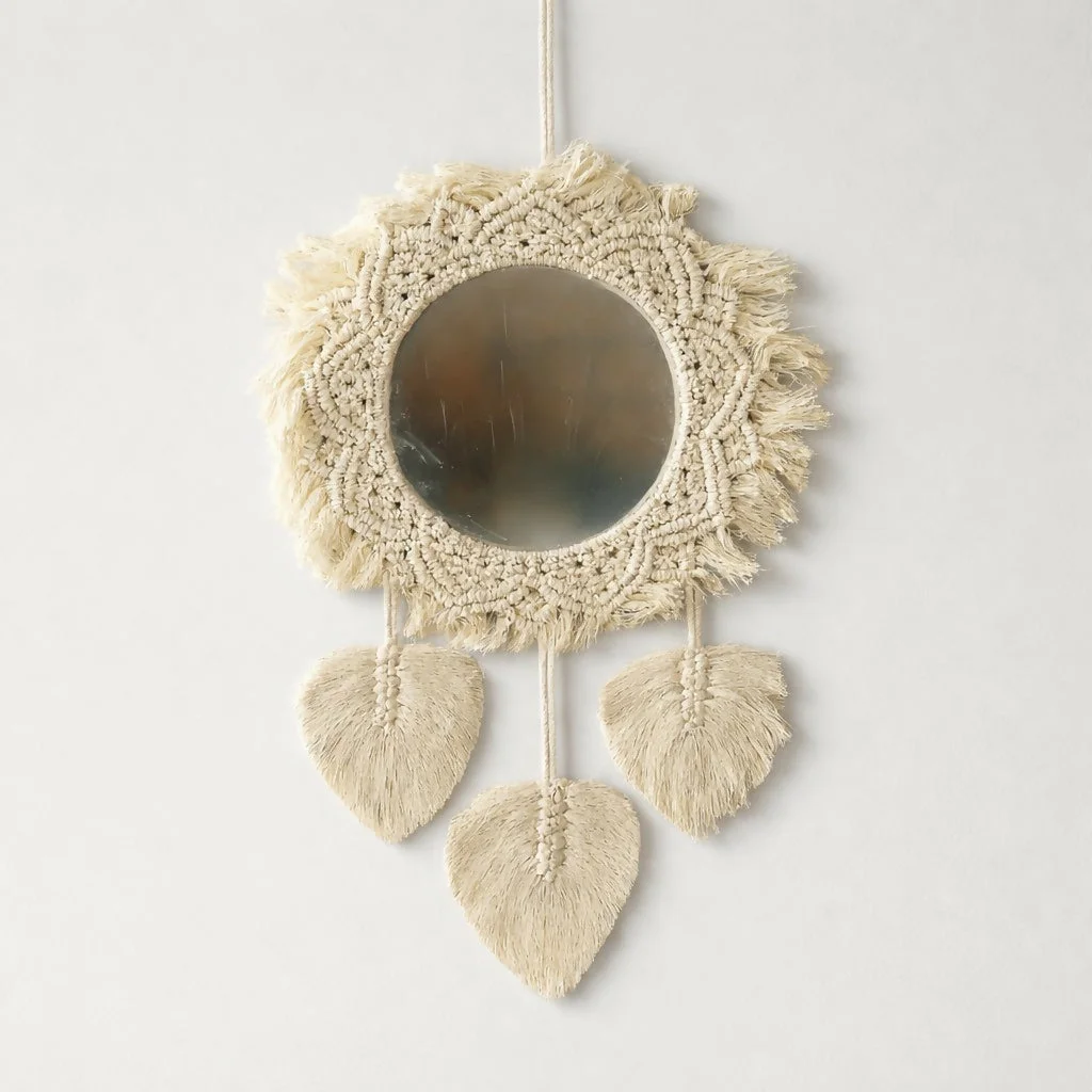 Add a stylish bohemian touch to your home with this beautifully handcrafted macrame wall mirror. Featuring a decorative woven cotton frame with elegant tassel accents, this mirror combines functionality with artistic design. The intricate macrame pattern creates a warm and natural aesthetic, making it a perfect accent piece for bedrooms, living rooms, entryways, or dressing areas. Ideal for enhancing wall décor while adding depth and brightness to your interior space.