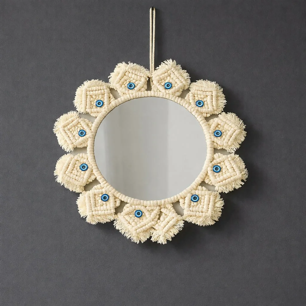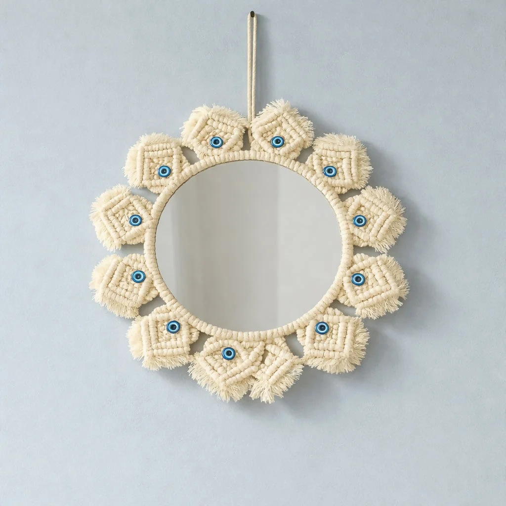 Enhance your interior décor with this elegant macrame wall mirror featuring a beautifully handcrafted woven frame. Designed with intricate cotton rope patterns and decorative accents, this mirror adds a stylish bohemian touch to any space. The round mirror design not only serves as a functional piece but also acts as a statement décor element that brightens and enlarges your room visually. Perfect for bedrooms, living rooms, entryways, or kids’ rooms, it complements modern, minimalist, and boho-style interiors effortlessly.