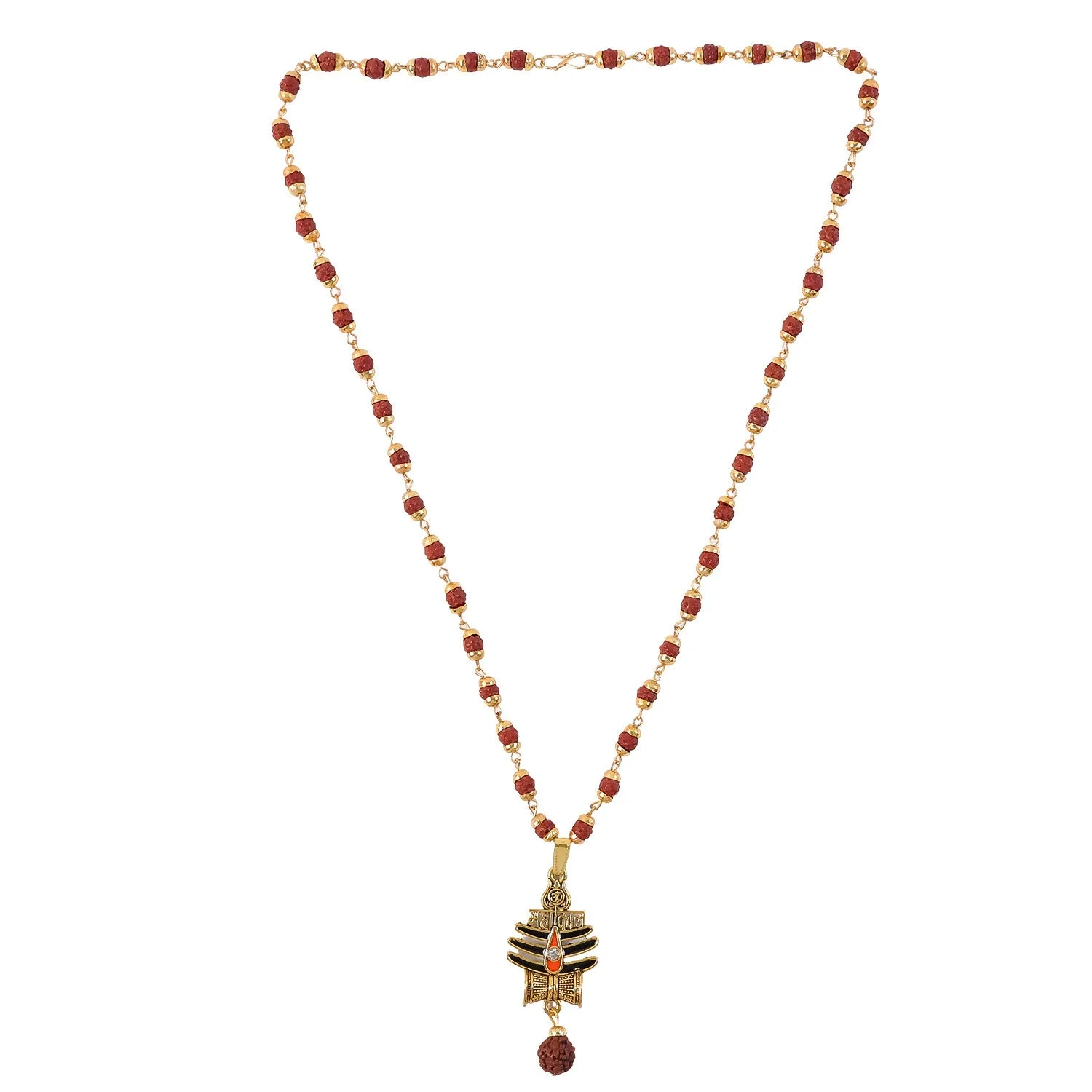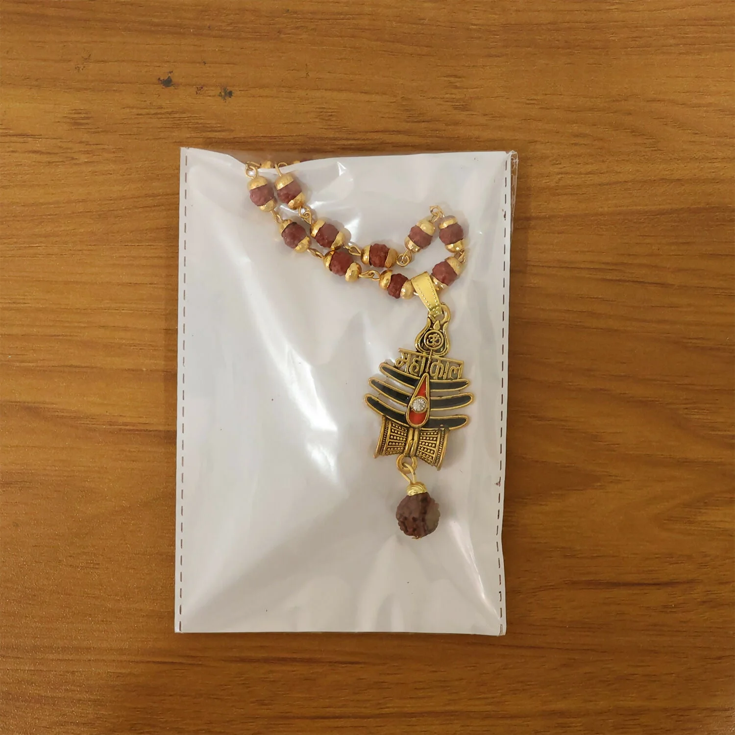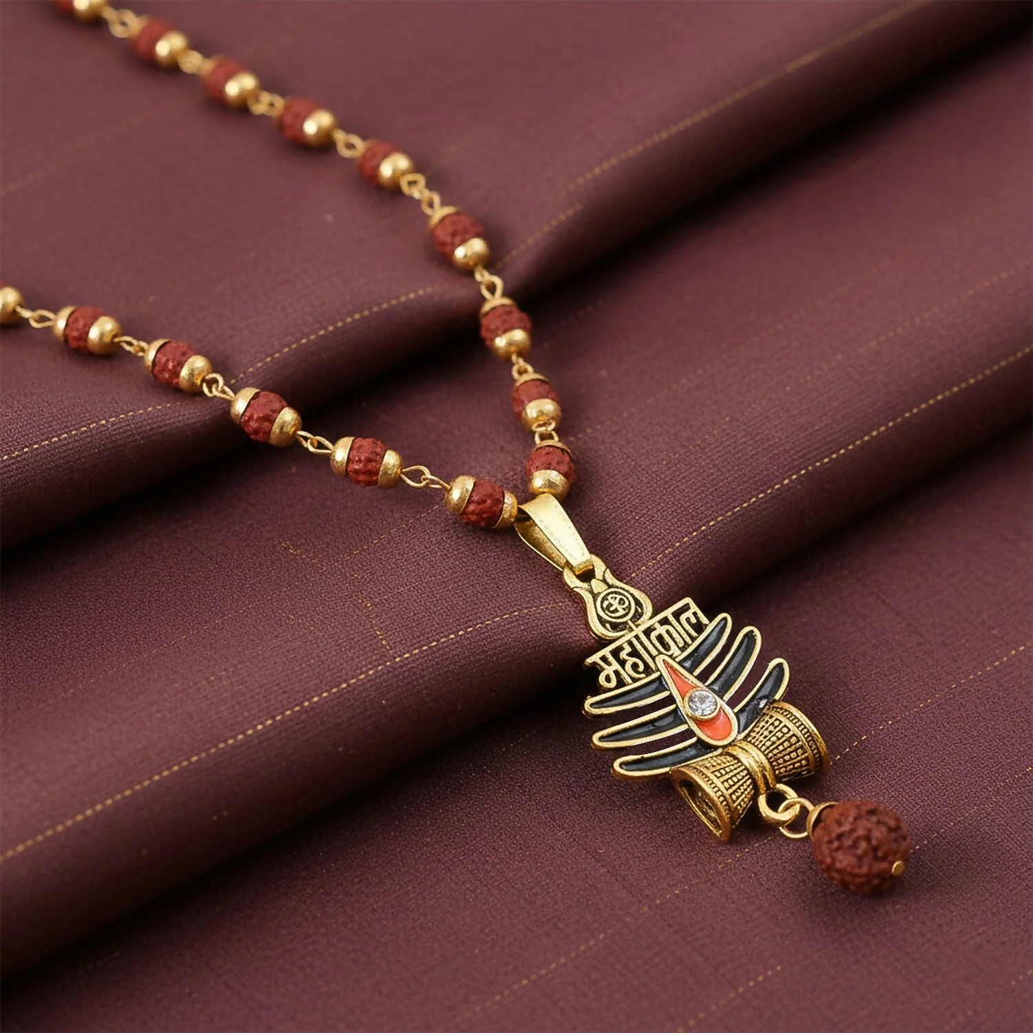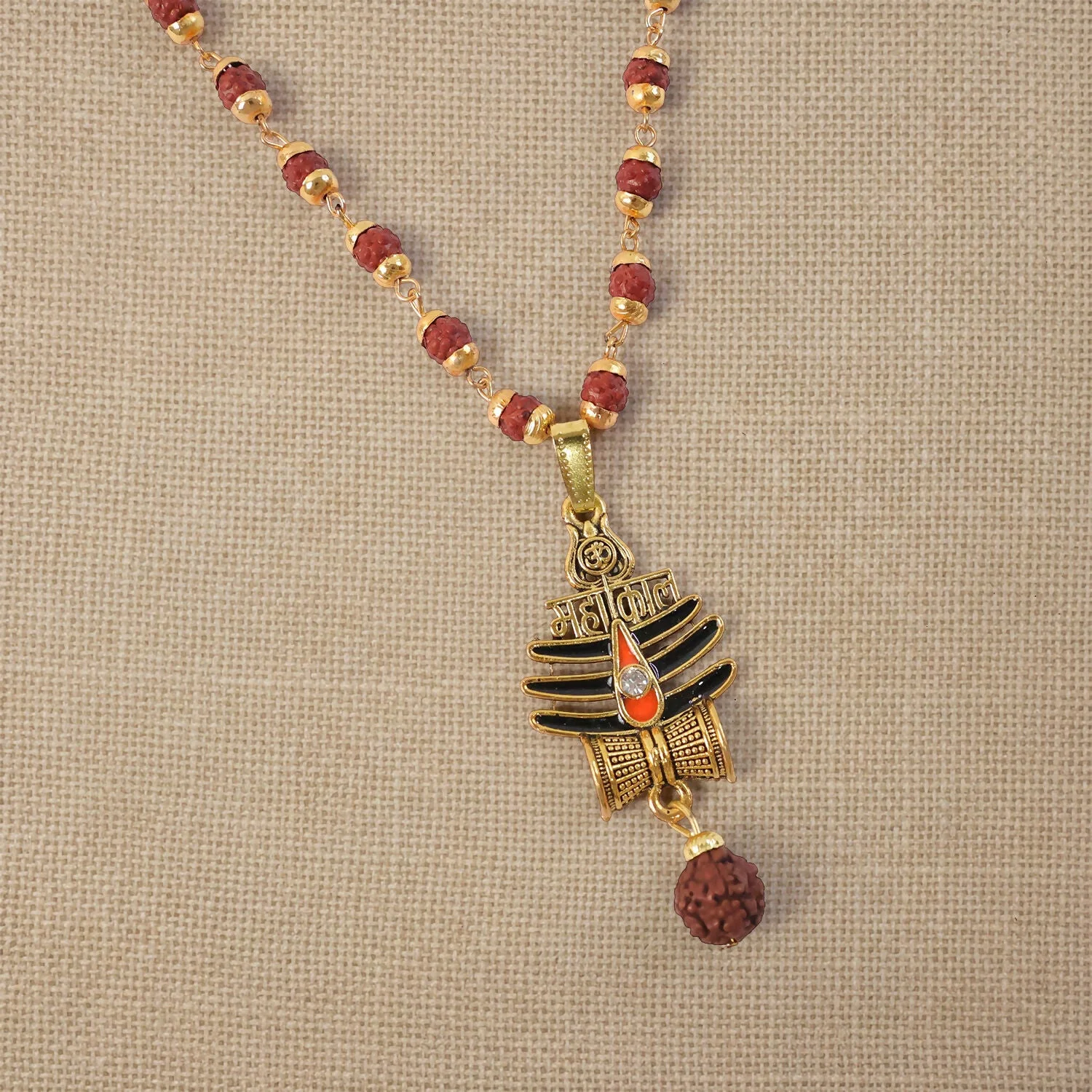 Channel divine strength and tranquility with this masterfully designed Shiva Trishul Pendant paired with a sacred Rudraksha bead mala. This necklace is a perfect blend of traditional spirituality and ornate craftsmanship, making it a meaningful accessory for daily wear or special occasions.Symbol of Power: The pendant showcases the Trishul (trident), representing the three fundamental aspects of existence, integrated with a detailed figure of Lord Shiva.Sacred Rudraksha Beads: The chain is composed of authentic-looking Rudraksha beads encased in gold-toned caps, traditionally used for protection and focus.Exquisite Craftsmanship: Features an antique gold-finish pendant with intricate engravings and a hanging Rudraksha bead for a balanced, elegant look.Spiritual Connection: Designed for those seeking a tangible connection to Mahadev, symbolizing wisdom, power, and auspiciousness.
