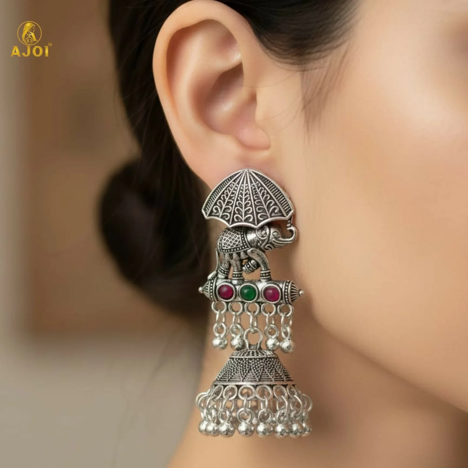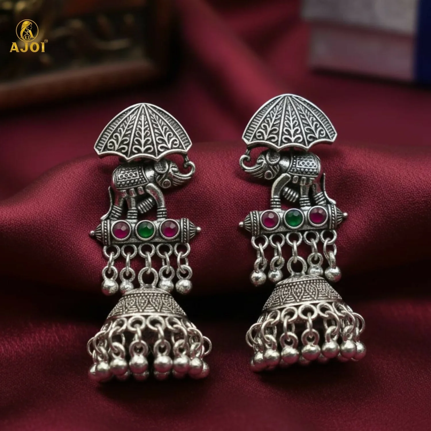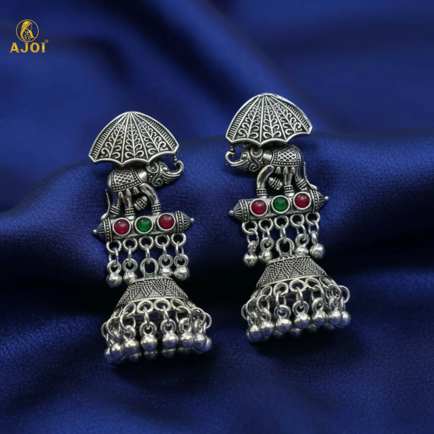 Step into regal elegance with these exquisitely handcrafted Maharaja Elephant Motif Jhumka Earrings, inspired by royal Indian heritage. Designed in a rich oxidized silver finish, the majestic elephant silhouette symbolizes strength, prosperity, and timeless tradition.