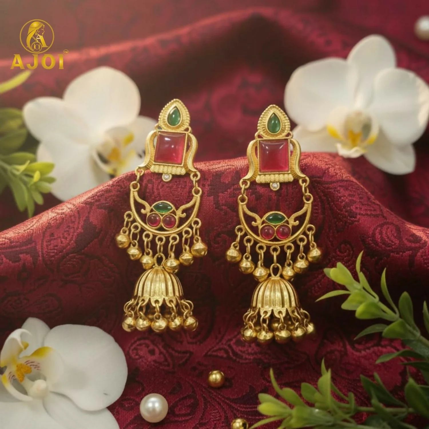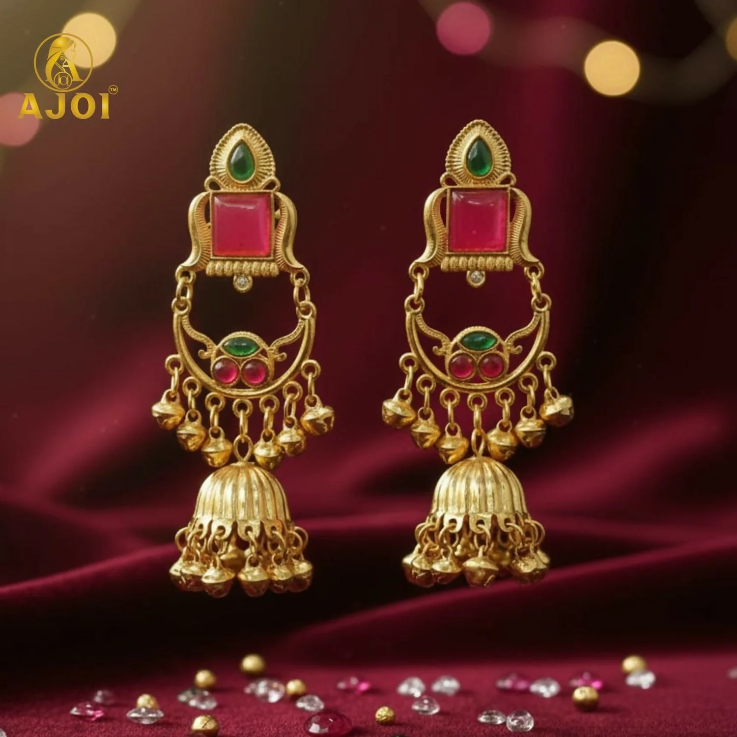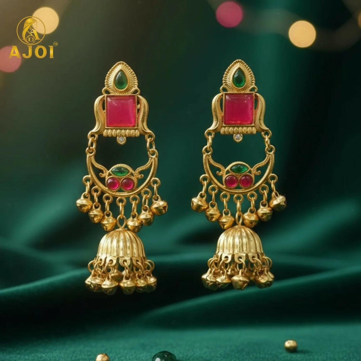 Add a royal touch to your jewellery collection with these premium gold plated jhumka earrings, beautifully designed to reflect traditional elegance. The earrings feature a stylish top stud adorned with a green teardrop stone and a square red stone, giving a rich and graceful appearance.