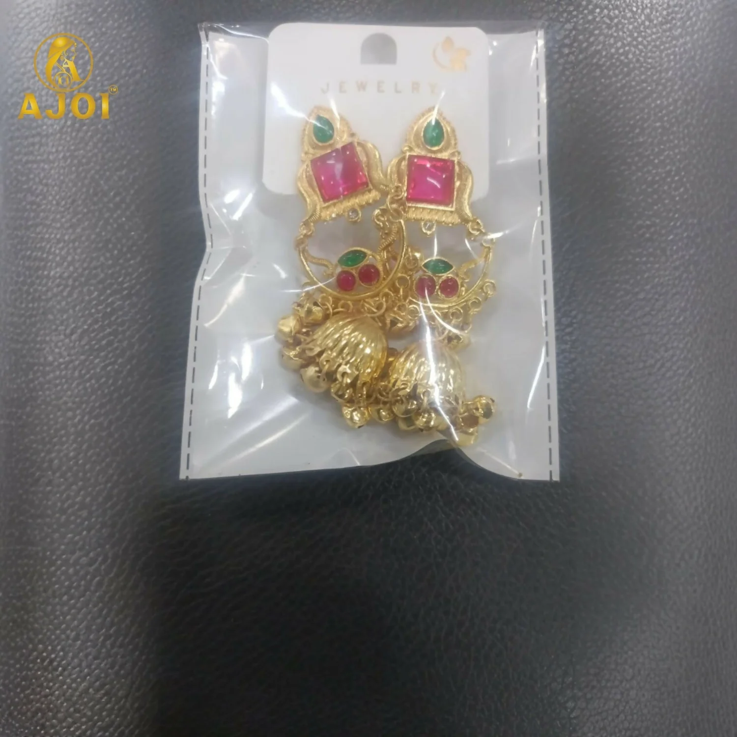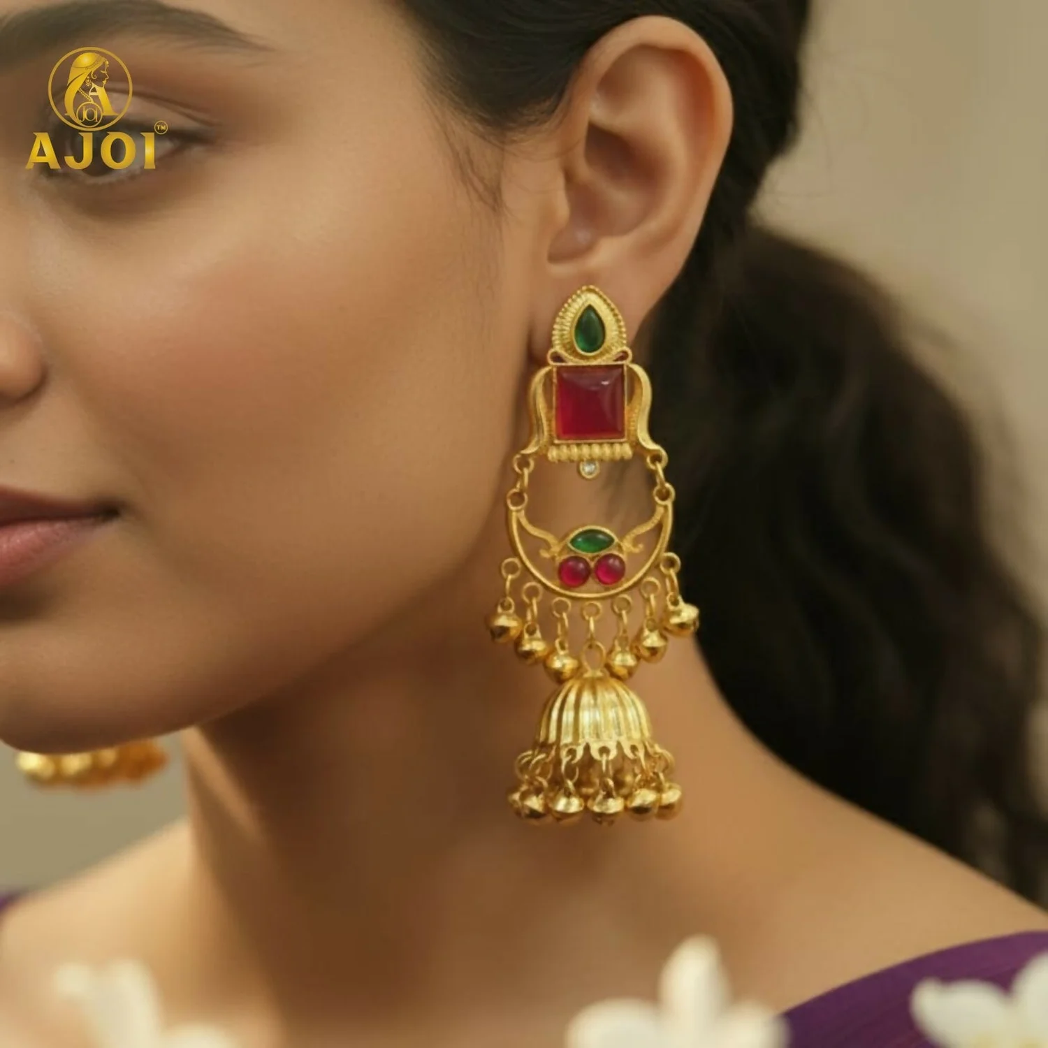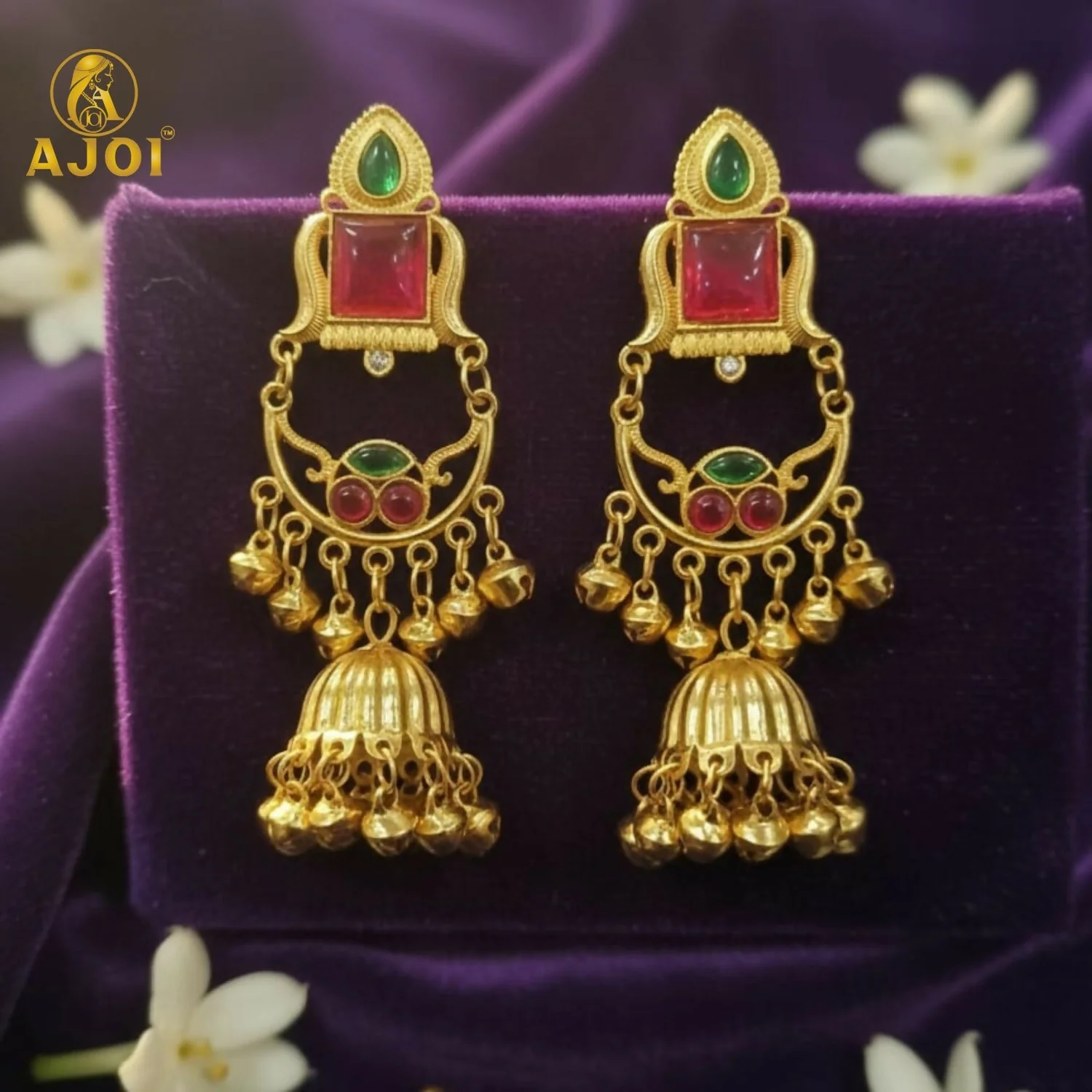 Add a royal touch to your jewellery collection with these premium gold plated jhumka earrings, beautifully designed to reflect traditional elegance. The earrings feature a stylish top stud adorned with a green teardrop stone and a square red stone, giving a rich and graceful appearance.