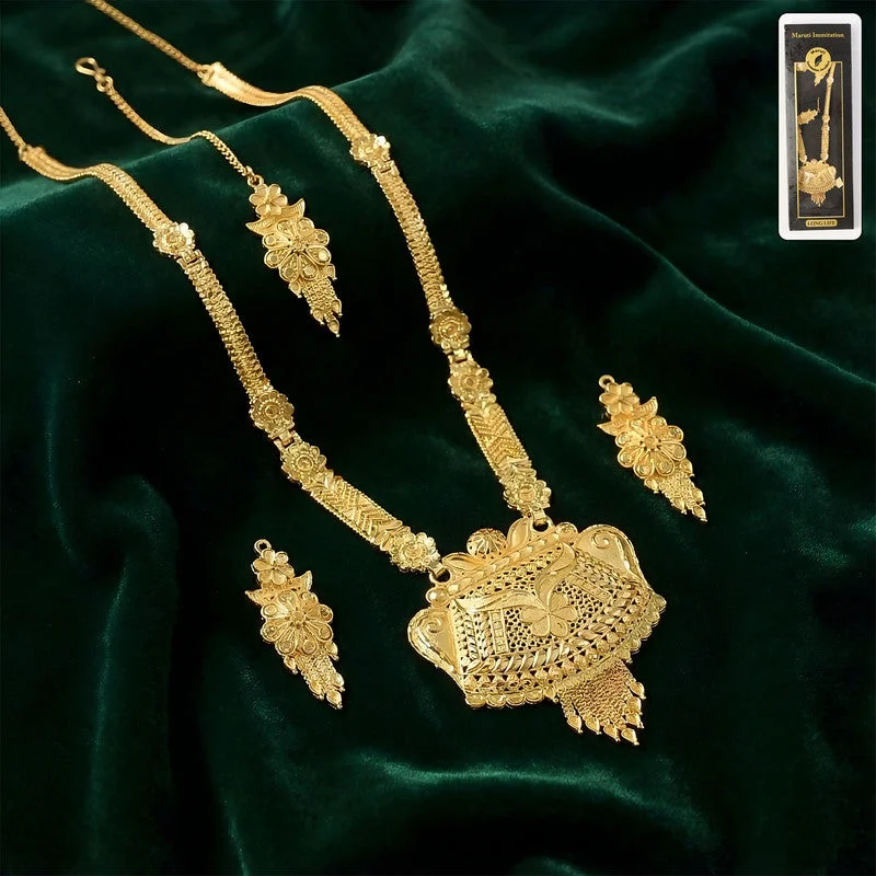 This stunning long necklace set features remarkable handcrafted detailing, giving it a luxurious and culturally rich appeal. The grand pendant, paired with ornate earrings and a finely carved tikka, makes this set perfect for weddings, festive occasions, and traditional ceremonies. Its deep gold finish adds a regal aura that beautifully complements sarees, lehengas, and ethnic ensembles. Designed for those who admire classic Indian artistry, this jewelry set brings elegance and heritage together in one radiant piece.
