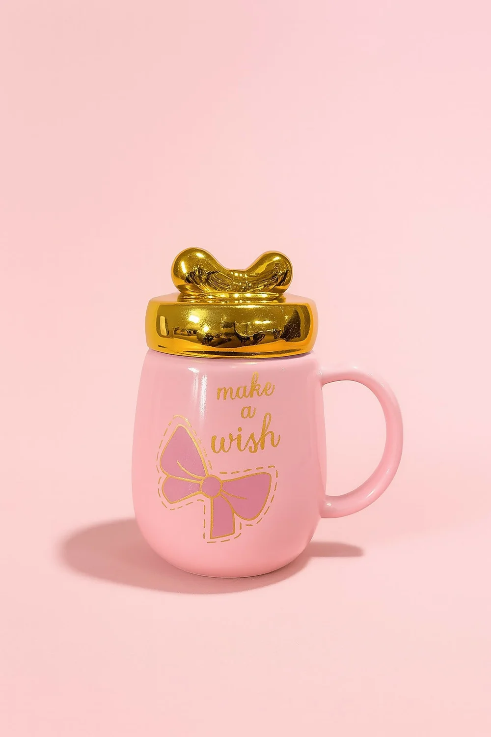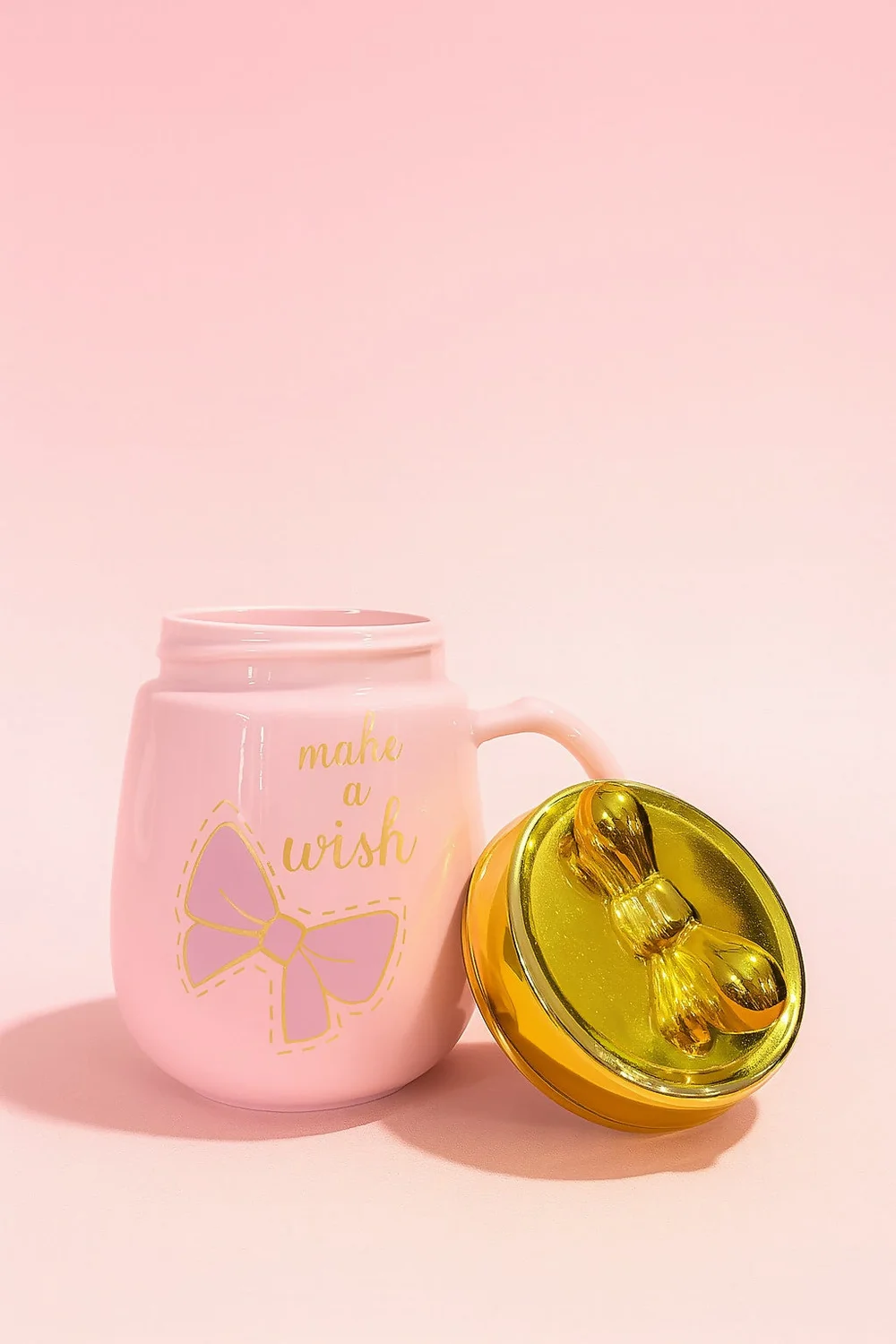 Charming Pink Design: Glossy pink ceramic body with “Make a Wish” quote and bow graphic.