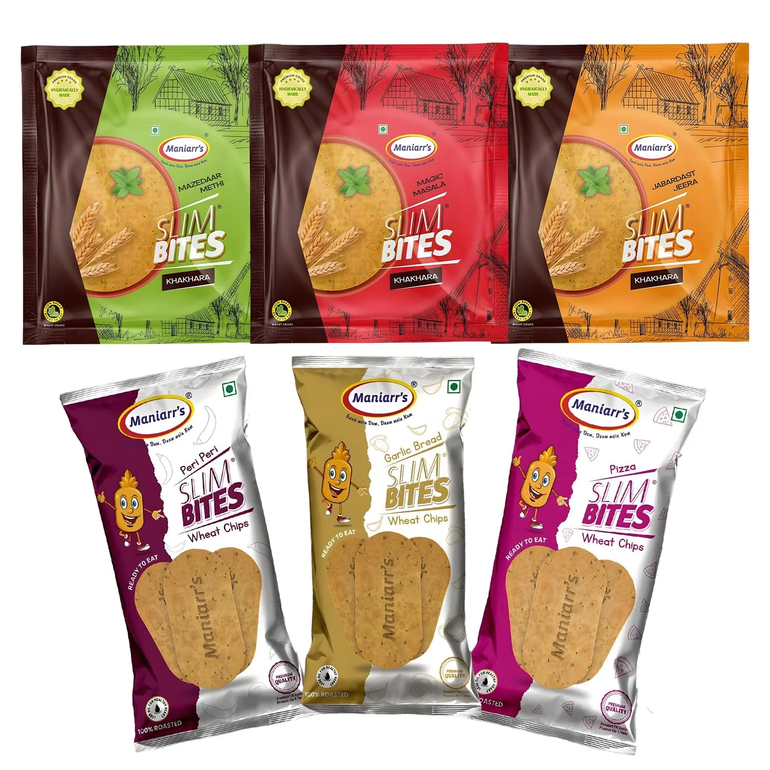 This combo contains 6 (3 Big & 3 small)packets of slim bitesThis & Jain Khakhra Wheat Chips Combo brings you. Flavours are subject to availability.