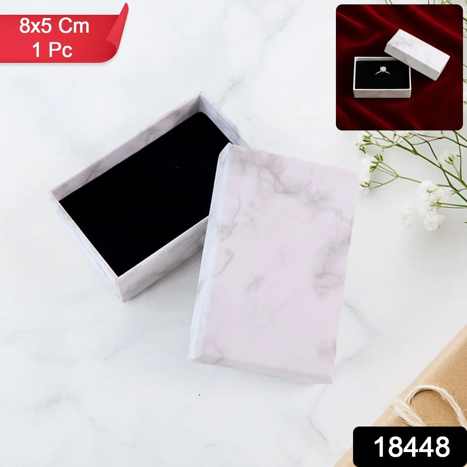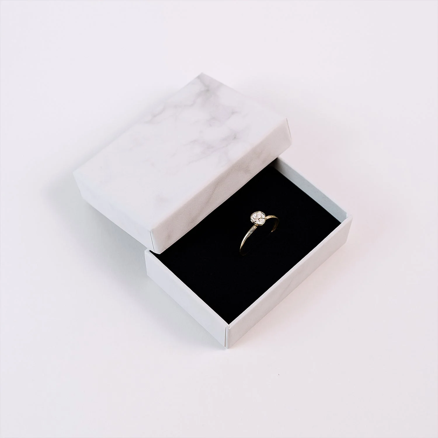 Present your jewelry with elegance using this Marble Finish Empty Gift Box. Crafted from durable rigid cardboard and finished in a soft marble print, this compact box includes a plush black velvet insert to securely hold and protect rings, earrings, or small pendants. Its stylish yet minimalist design makes it ideal for upscale packaging, gifting, or displaying fine jewelry. Lightweight and durable, this box enhances the value of your product presentation without compromising on protection.