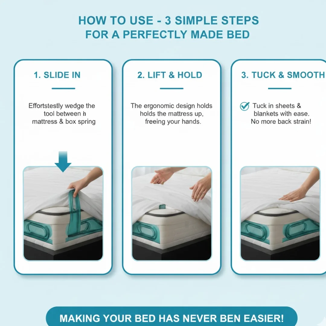 - The mattress lifter tool, with ergonomic design that effortlessly lifts a mattress. No more need of a partner when making the bed.