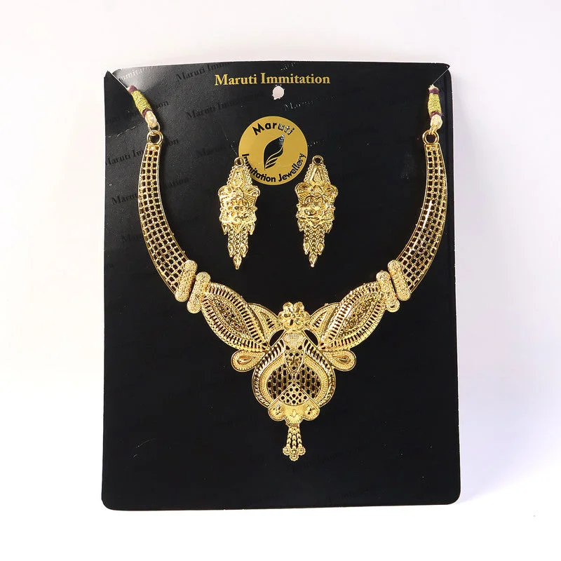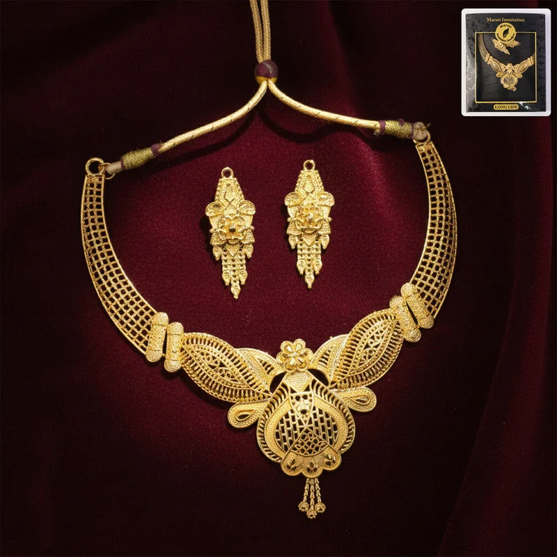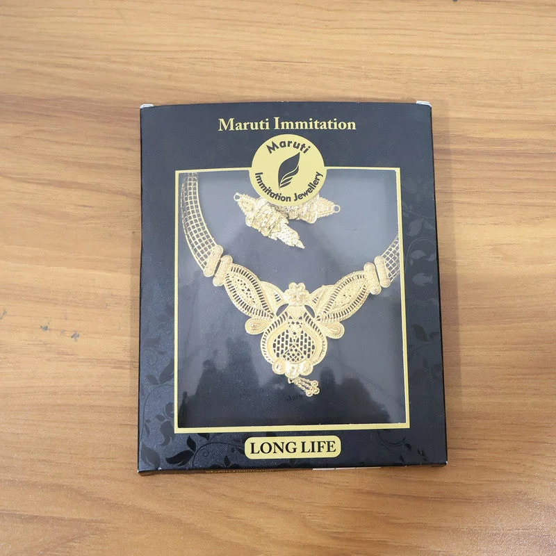 This exquisite choker necklace set features a beautifully designed mesh-style structure paired with intricate handcrafted detailing that gives it a luxurious traditional appeal. The centerpiece showcases layered patterns and delicate artistry, creating a bold yet refined statement perfect for festive celebrations and bridal wear. The adjustable cord ensures a comfortable fit while maintaining the premium choker silhouette. Matching earrings complete the ensemble with their finely detailed design, offering a cohesive and sophisticated ethnic look. This set is ideal for women seeking a unique blend of elegance, craftsmanship, and timeless charm.