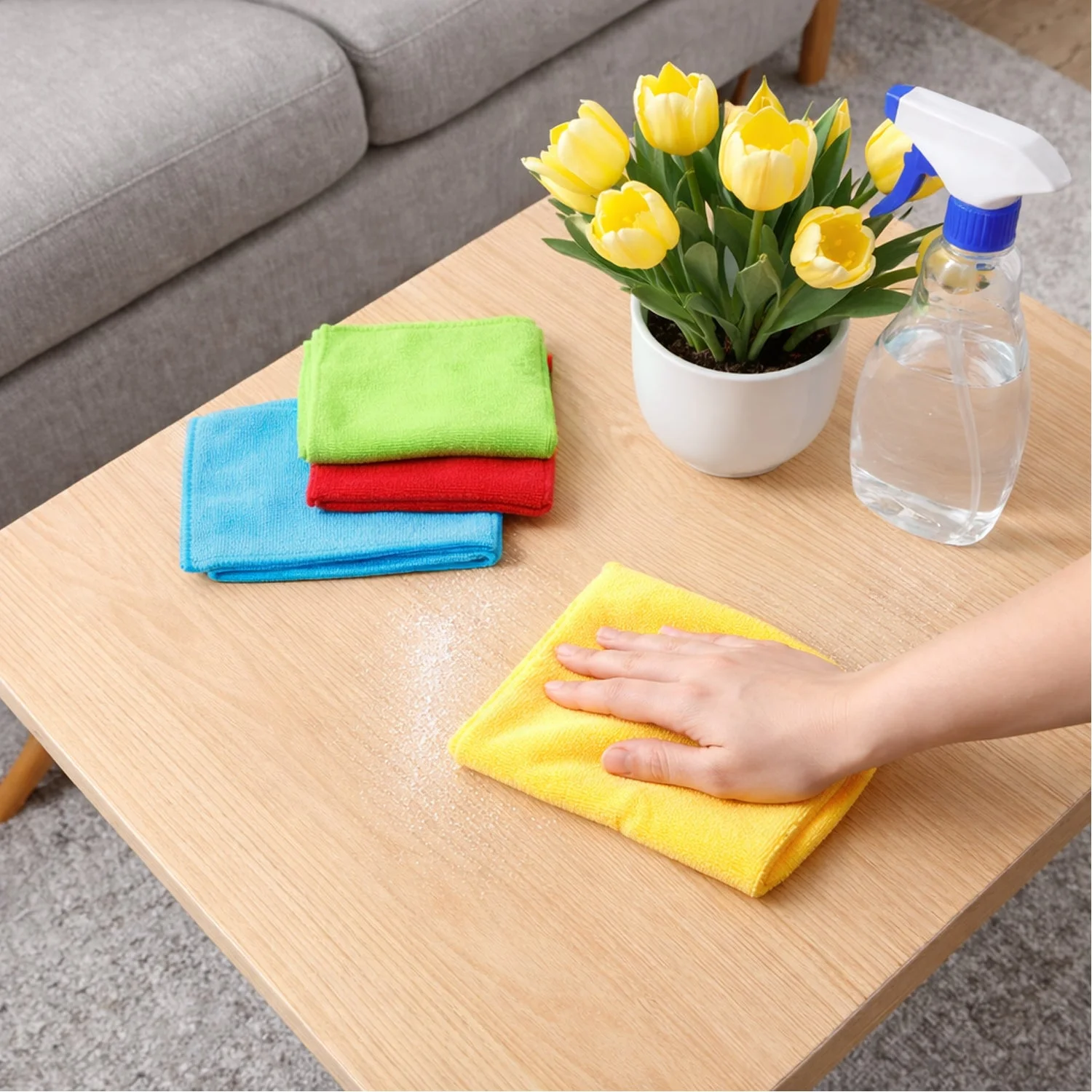 Keep your home and workspace spotless with this microfiber cleaning cloths 4 piece set designed for effective and scratch-free cleaning. Made from ultra-soft microfiber fabric, these towels easily lift dust, dirt, grease, and moisture without leaving streaks or lint behind. Perfect for kitchen counters, glass surfaces, furniture, electronic screens, and car interiors, these reusable cloth napkins provide powerful cleaning performance with or without cleaning liquids. The highly absorbent material ensures quick drying and long-lasting use. Ideal for daily household cleaning, these multipurpose microfiber towels are durable, washable, and eco-friendly, making them a smart addition to your cleaning essentials.