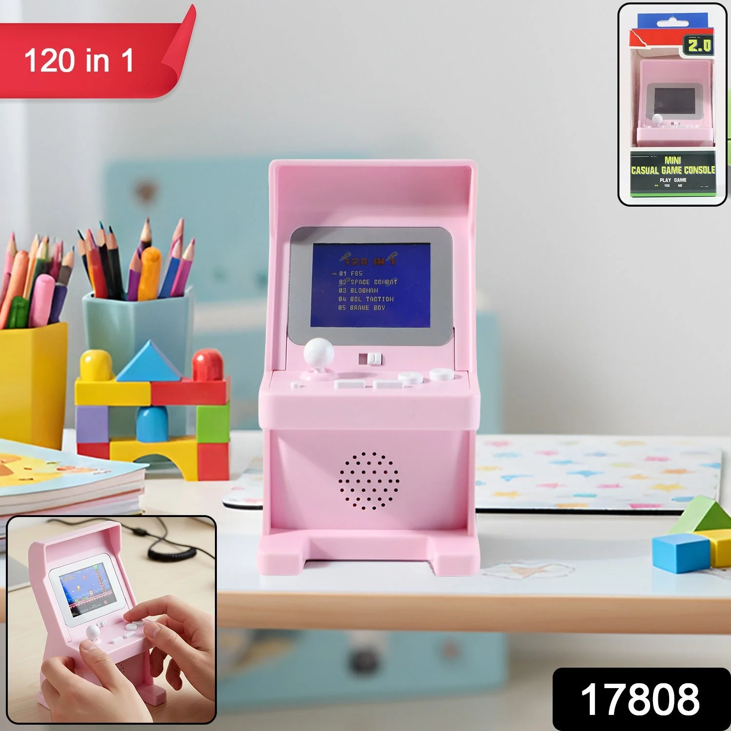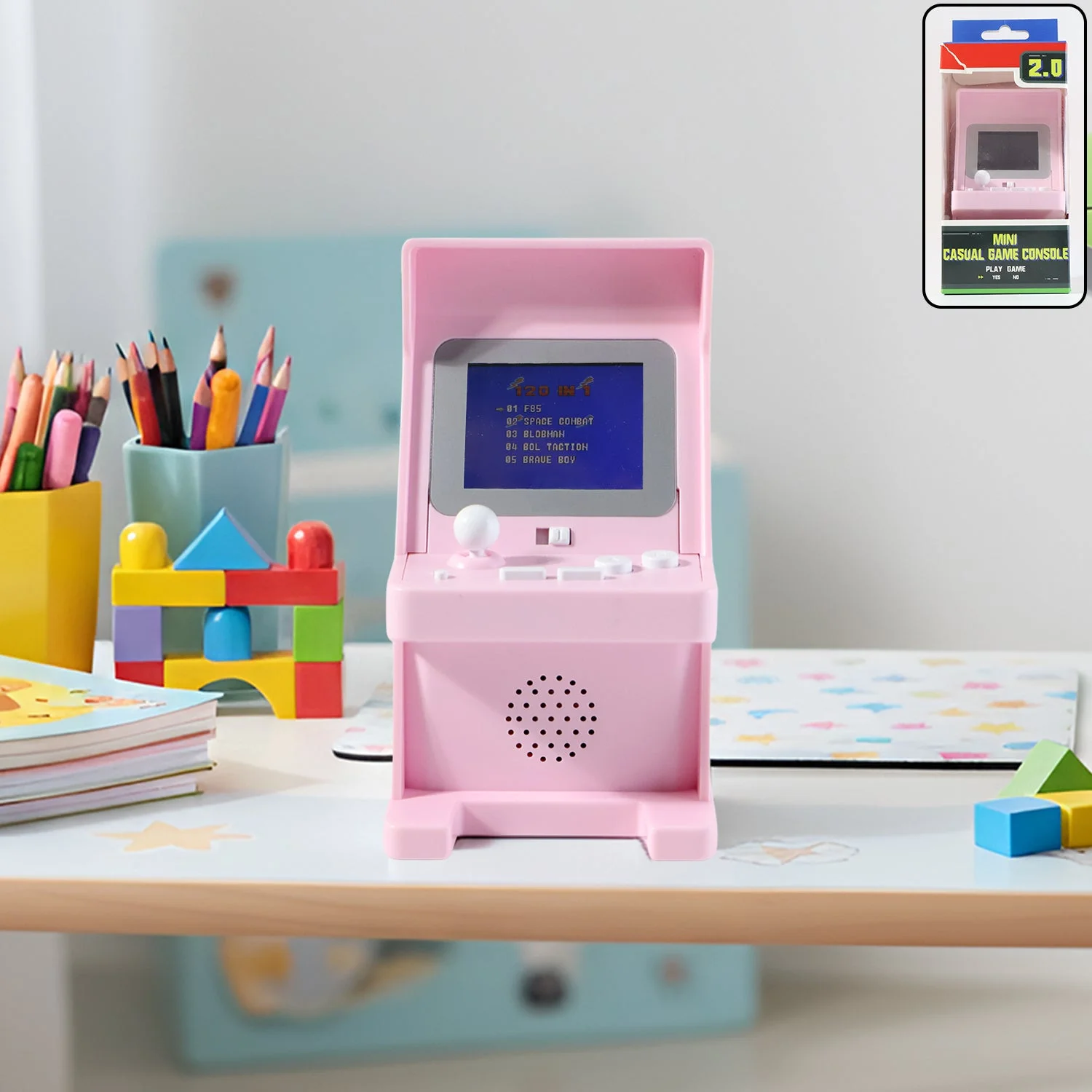 This mini retro arcade gaming console brings the charm of old-school gaming into a compact, kid-friendly, and stylish tabletop design. Loaded with 120 built-in games, it offers endless entertainment without the need for downloads, Wi-Fi, or additional cartridges. The crisp display, responsive control buttons, and joystick-style movement recreate the nostalgic arcade feel, making gameplay enjoyable for both children and adults. Built with a stable stand and a front-facing speaker, it delivers clear sound and smooth play. Lightweight and portable, it fits perfectly on study tables, office desks, or travel bags, making it a fun companion at home, school, and outings.