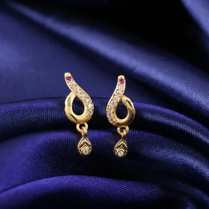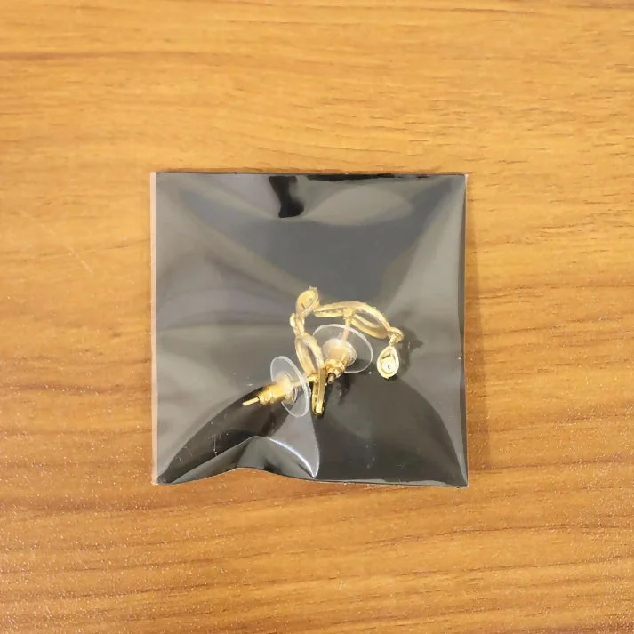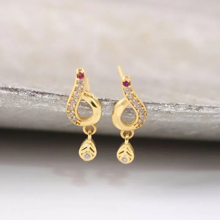 Be the first to review Minimal Curved Leaf Gold Earrings With Crystal Line Work And Small Drop Detailing!