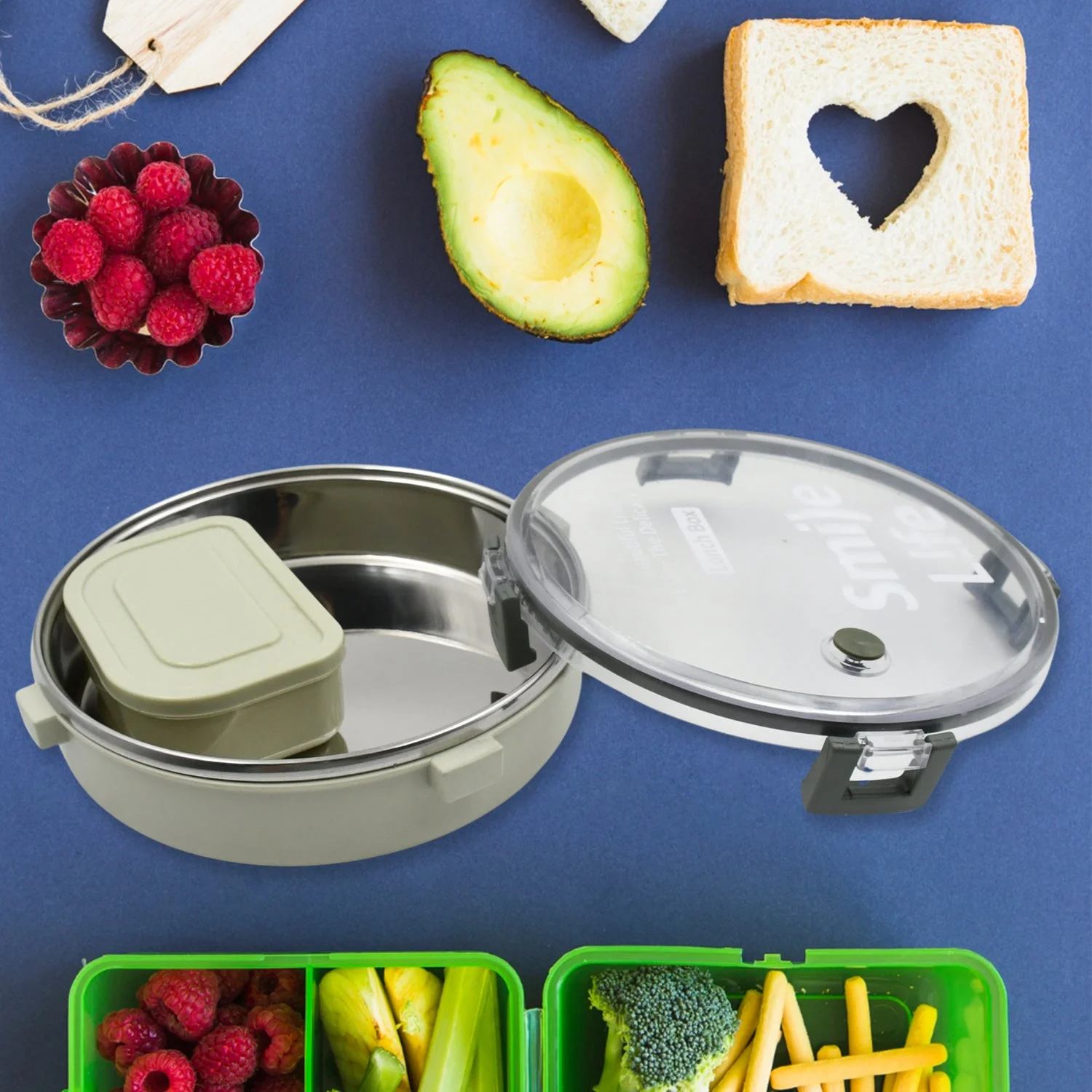 - Design and Construction: Stainless steel round lunch container designed for practical meal transportation.
