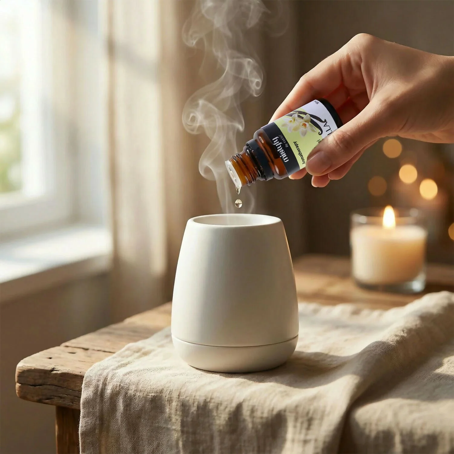 Transform any room into a cozy, inviting haven with the Mistyfy Warm Caramel Vanilla Aromatherapy Set. This beautifully designed white ceramic ultrasonic diffuser pairs perfectly with our signature 10 ml Warm Caramel Vanilla diffuser oil. Simply add a few drops of the rich, comforting aroma to water, and let the whisper-quiet mist carry soothing notes of freshly scraped vanilla pods, sweet caramel, and delicate orchid blossoms throughout your space.