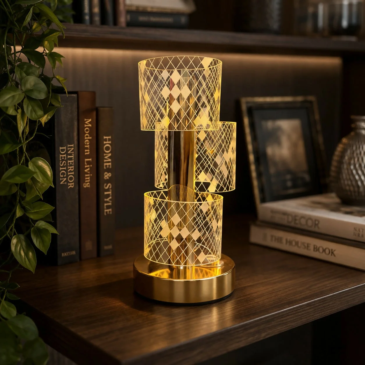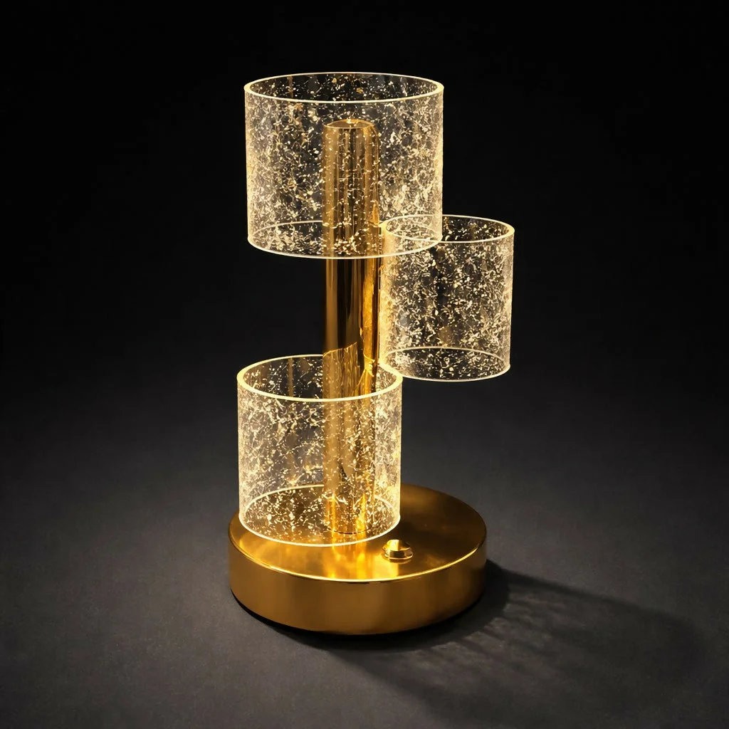 Enhance your space with this elegant crystal glow table lamp featuring a stylish gold finish base and beautifully patterned shades. Designed to create a warm and inviting ambiance, this decorative lamp is perfect for bedrooms, dressing tables, living rooms, or office desks. The unique multi-shade design adds a modern touch while reflecting soft light patterns, making it both functional and visually appealing. Ideal for home décor, gifting, or creating a cozy atmosphere.