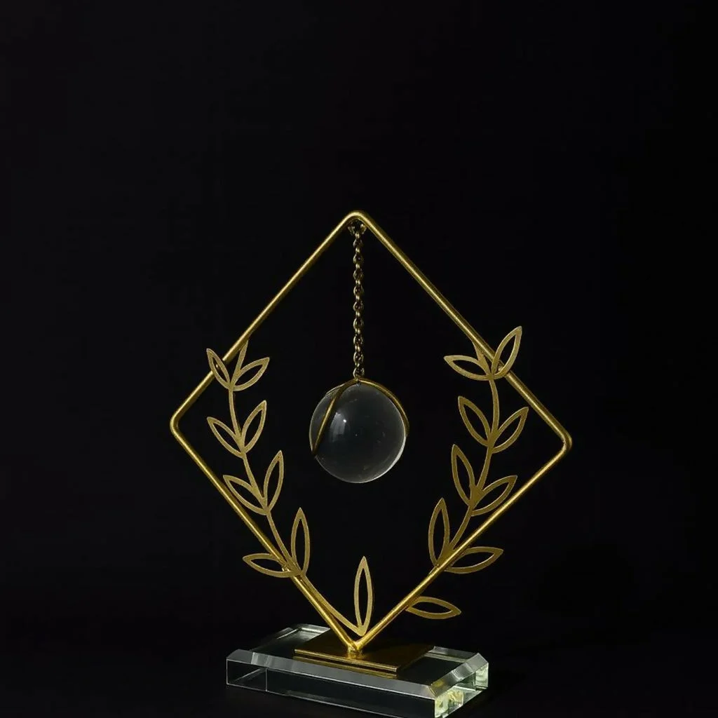 Add a touch of modern elegance to your home or office with this stylish crystal orb decorative showpiece. Designed with a sleek geometric metal frame and delicate leaf patterns, this décor piece features a suspended crystal sphere that creates a unique and eye-catching visual effect. The golden metal structure paired with a clear crystal ball and sturdy base gives it a luxurious and contemporary appearance. Perfect for decorating living rooms, office desks, shelves, or center tables, this artistic sculpture enhances the aesthetic appeal of any interior space. It also makes a wonderful gift for housewarmings, weddings, and special occasions.