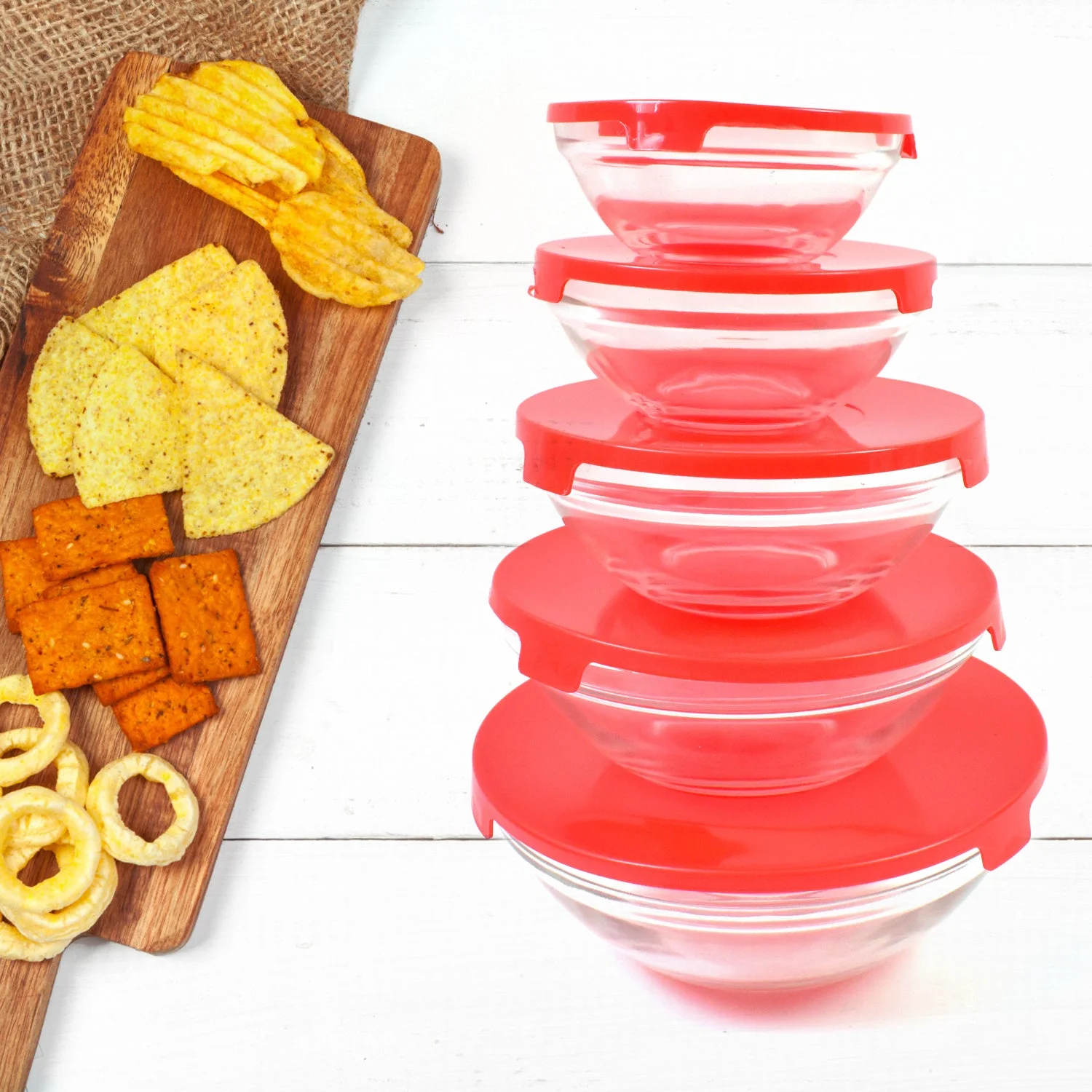 Modern Glass Bowl Set Mixing / Storage Bowls with Red Lids Food Storage Container Set with Lids - Microwave & Freezer Safe Multipurpose Kitchen Bowls Multicolour (5 Pcs Set)
