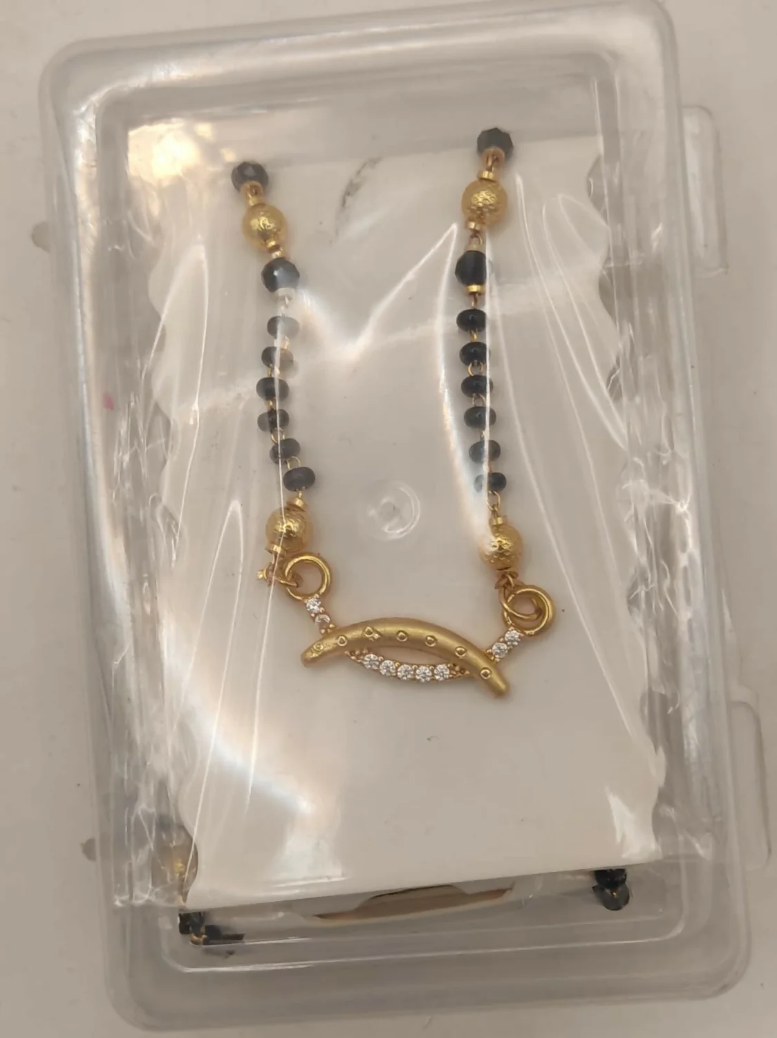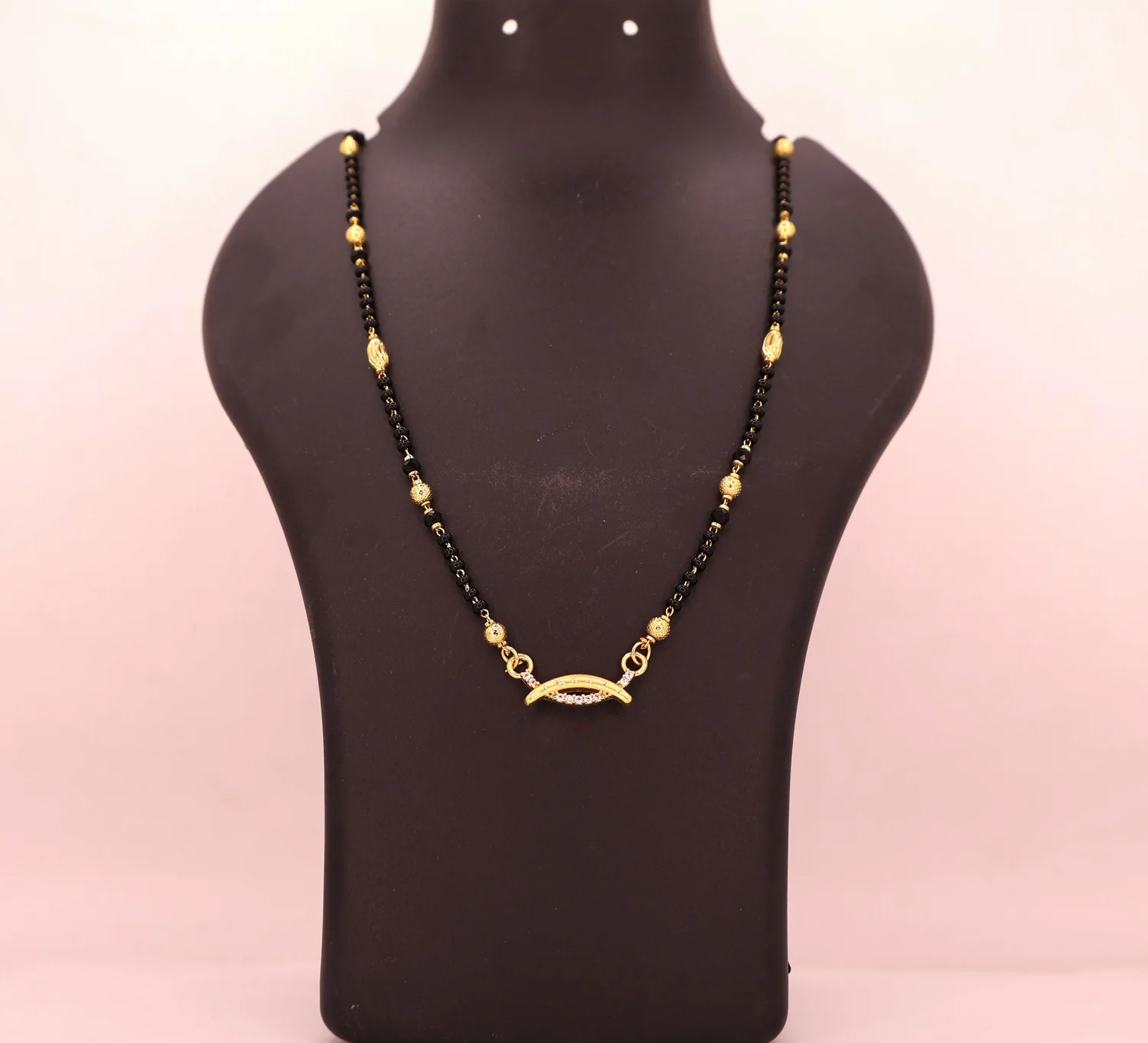 The pendant is suspended from a classic double-strand chain of high-quality black beads and textured gold spacers, symbolizing protection and marital bliss. Whether you’re heading to the office or a social gathering, its sleek and lightweight design ensures comfort without compromising on style.