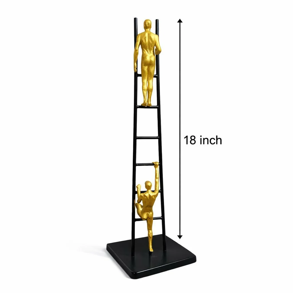 Add a modern artistic touch to your home or office with this unique ladder climbing man decorative sculpture. Featuring two golden human figurines climbing a sleek black ladder structure, this contemporary showpiece symbolizes ambition, progress, and determination. The elegant black and gold finish creates a sophisticated visual appeal that enhances any interior décor. Perfect for living rooms, offices, study tables, shelves, or display cabinets, this stylish sculpture acts as both a decorative accent and an inspirational art piece. Ideal for gifting on housewarmings, birthdays, and special occasions.