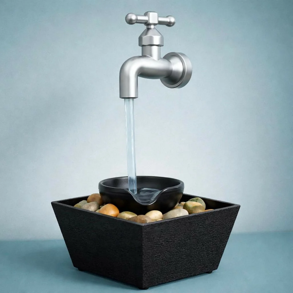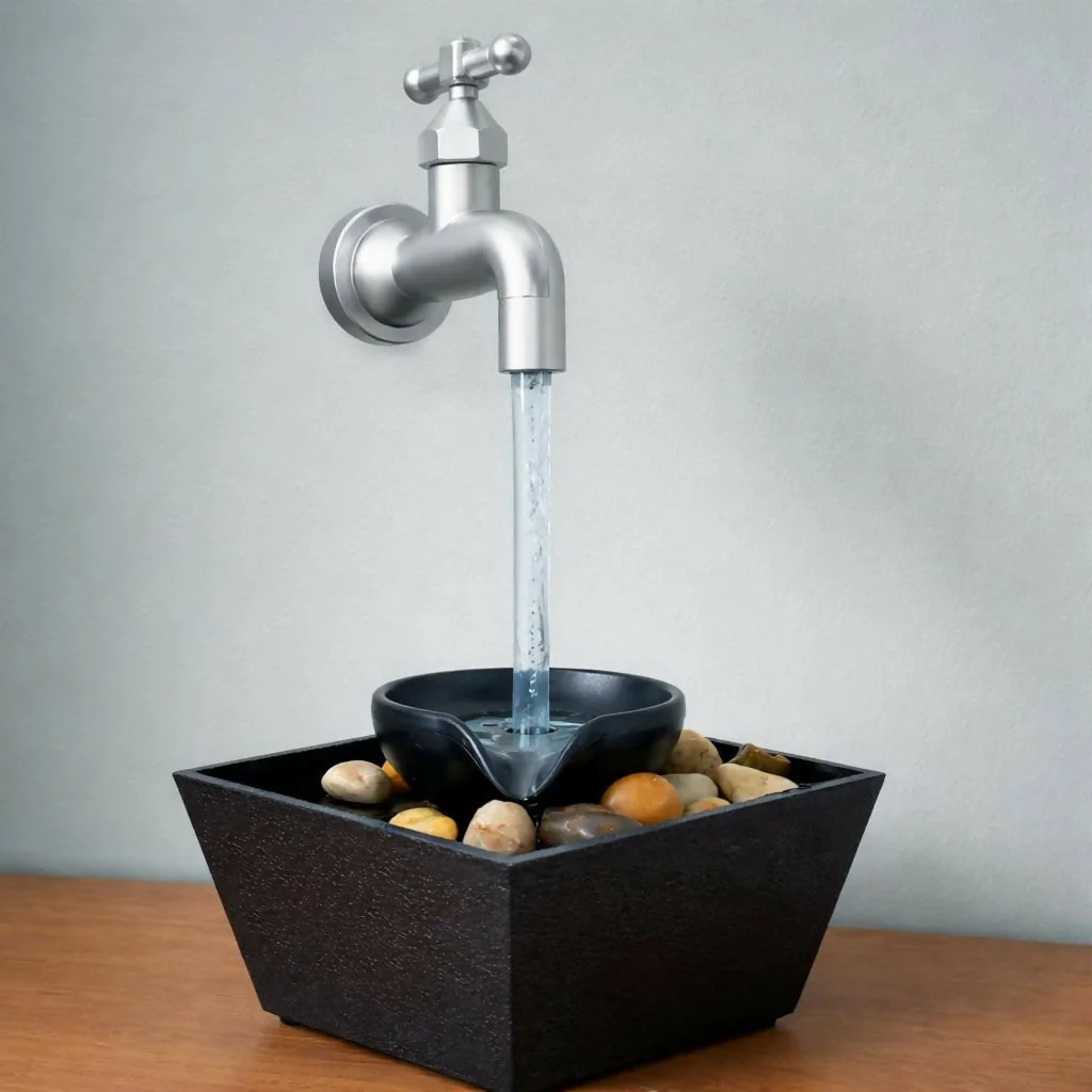 Add a contemporary touch to your décor with this modern tap-style tabletop water fountain. Designed to resemble a floating water tap effect, this unique indoor water feature creates a smooth, continuous water flow into the bowl below. Surrounded by decorative pebbles and set in a compact square base, it enhances any desk, coffee table, office cabin, or meditation space.