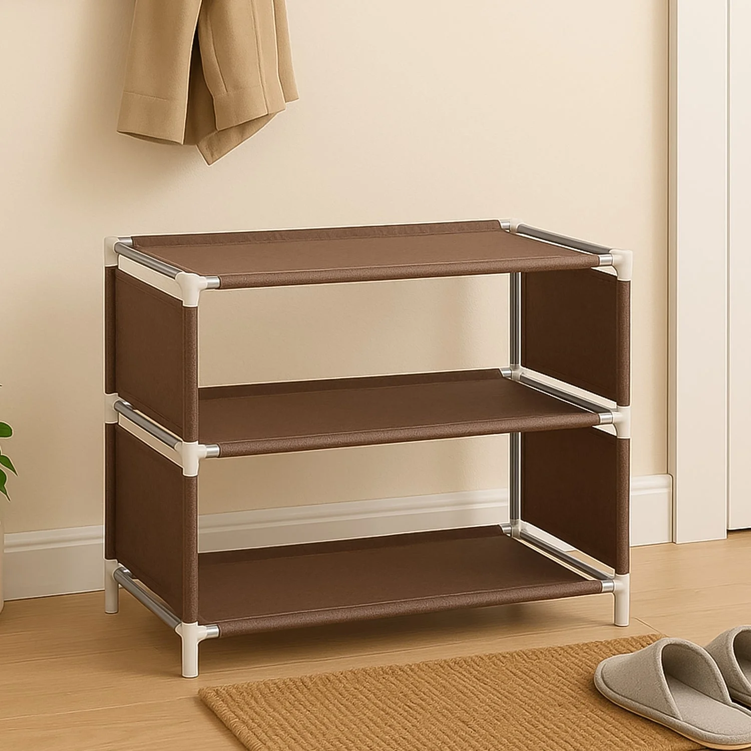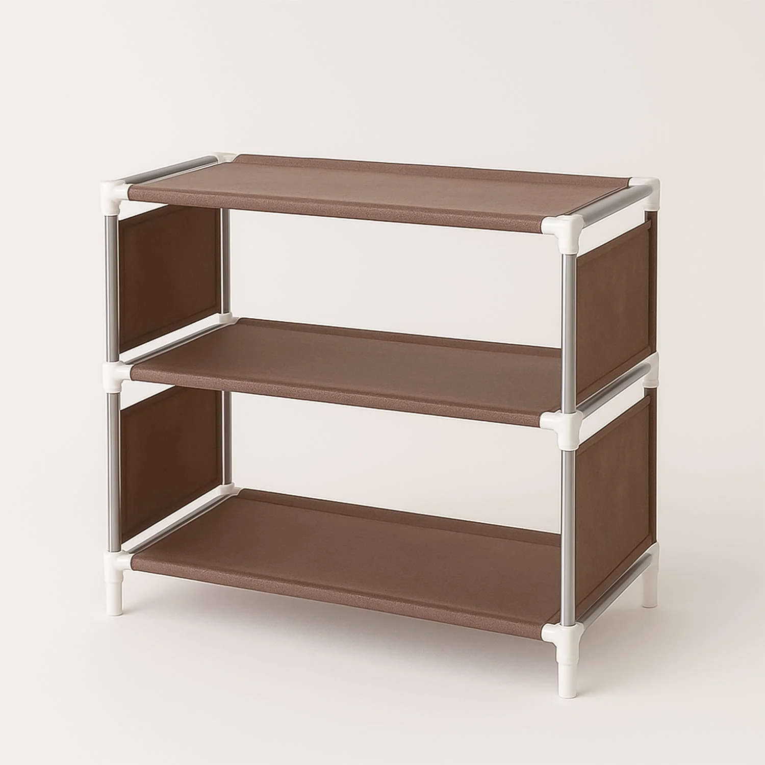 Breathable Fabric Shelves: Brown non-woven material ensures ventilation and easy cleaning.