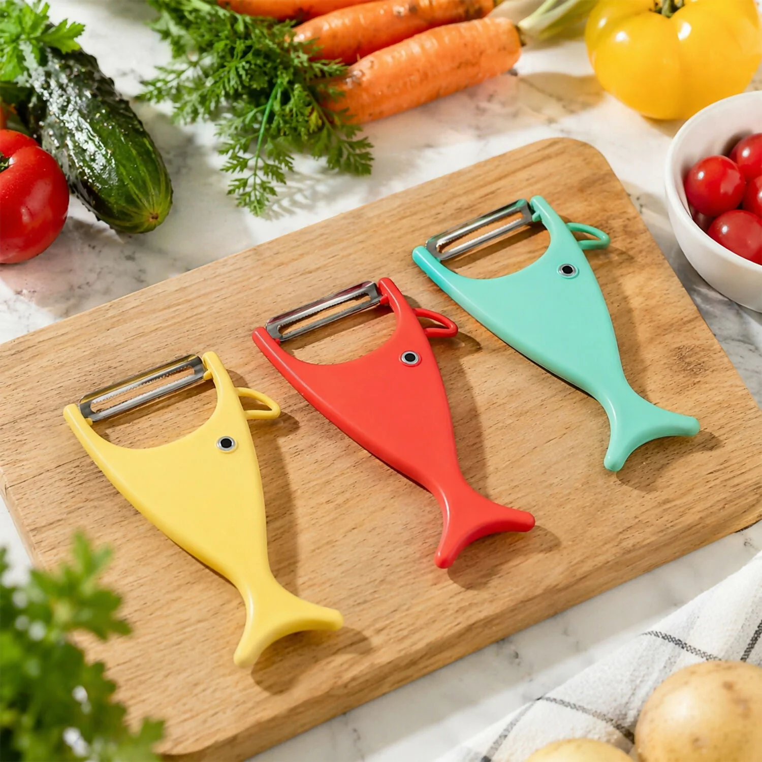 Make your kitchen tasks faster and more efficient with this uniquely designed fish-shaped vegetable and fruit peeler set. This Pack of 3 ensures you always have a peeler handy while adding a vibrant and modern touch to your kitchen tools collection.