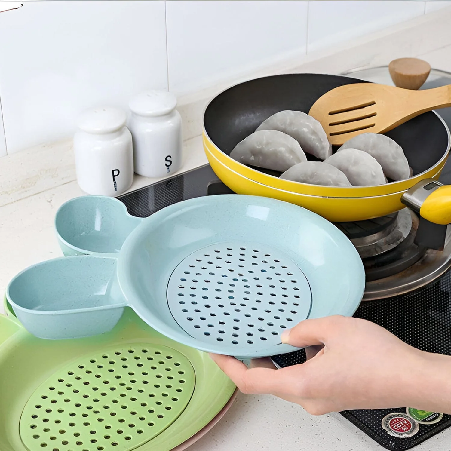multi-purpose serving plate, dumpling serving plate, snack serving tray, serving plate with strainer, plate with dual sauce compartments, creative food serving tray, momos serving plate, dim sum serving tray, appetizer serving plate, compartmentalized snack tray, kitchen serving dish, party snack plate, versatile food tray